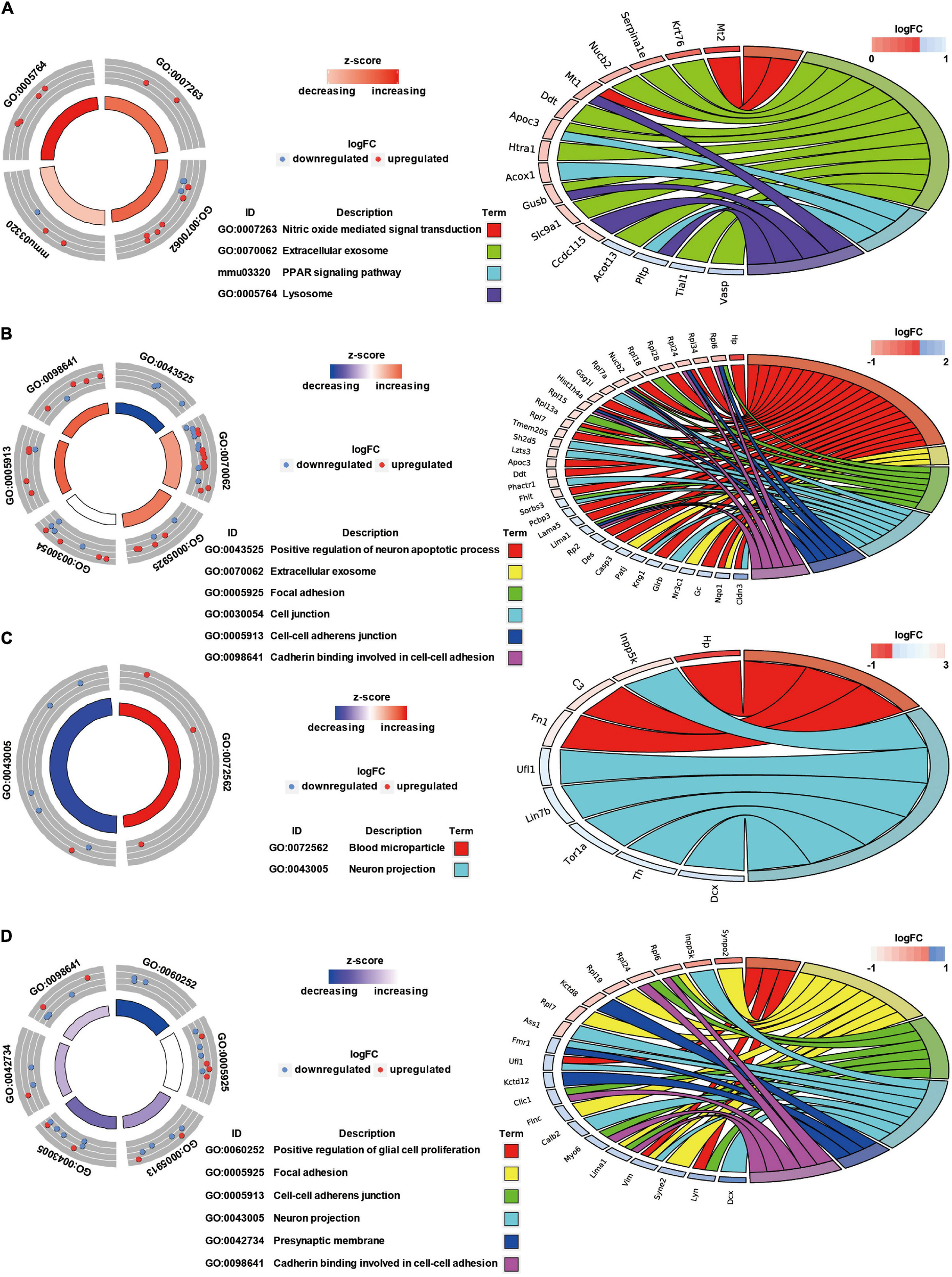 GO annotation and canonical pathways in brain injury caused by chest blast. (A) 12–24 h after blast exposure; (B) 24–48 h after blast exposure; (C) 48–72 h after blast exposure; (D) 72 h–1 week after blast exposure. GO circle diagram shows the functional enrichment analysis results of different genes in each group. GO chord diagram shows the relationship between genes and pathways. Each protein classified into cellular components and canonical pathways was marked with the same color. Each cluster of cellular components and canonical pathways in the plot is assigned a unique color. Each connection between proteins in the cellular components or canonical pathways represented the fold change.