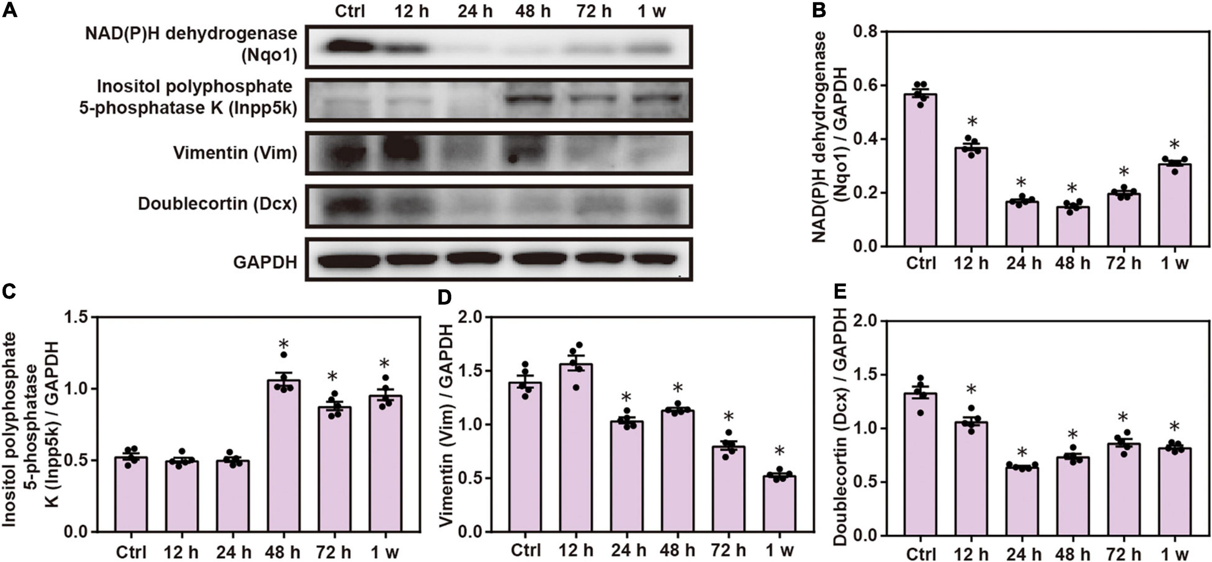 Expression changes in key neuronal proteins induced by chest blast. (A) Western blot images of the differentially expressed protein Nqo1 after chest blast exposure. The expression levels of (B) Nqo1, (C) Vim, (D) Dcx, and (E) Inpp5k with normalized to internal control GAPDH. All experiments were repeated at least three times. All data were expressed as mean ± SEM (n = 5) and analyzed by a one-way ANOVA, followed by Tukey’s test for multiple comparisons. Differences were considered statistically significant at p < 0.05 for all analyses. ∗p < 0.05 vs. control group.