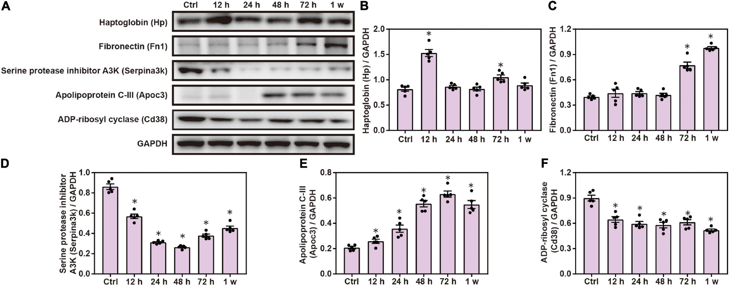 Changes in inflammatory response proteins in the brain induced by chest blasts. (A) Western blot images of differentially expressed proteins after chest blast exposure. The expression levels of (B) Hp, (C) Fn1, (D) Apoc3, (E) Serpina3k, and (F) Cd38 with normalized to internal control GAPDH. All experiments were repeated at least three times. All data were expressed as mean ± SEM (n = 5) and analyzed by a one-way ANOVA, followed by Tukey’s test for multiple comparisons. Differences were considered statistically significant at p < 0.05 for all analyses. ∗p < 0.05 vs. control group.