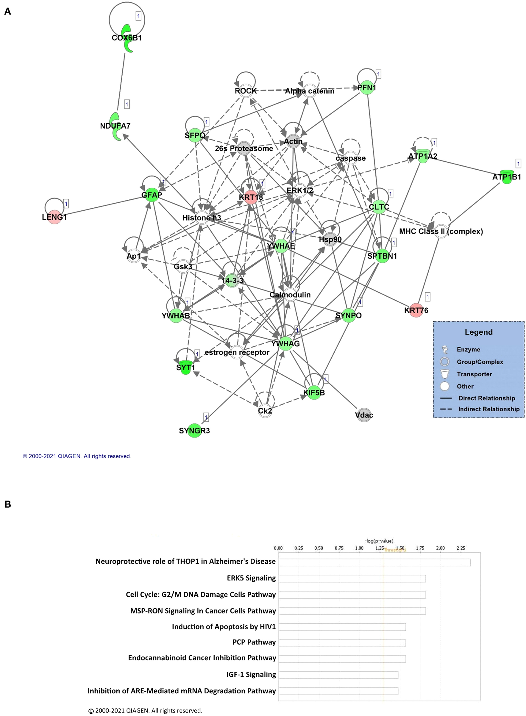 Next, we repeated the networks and pathways analyses for the male dataset. Similar to the female analysis, IPA detected 5 networks that contained interactions of the proteins identified as having significantly altered levels in K48-purified samples after fear learning. Moreover, the proteins with decreased abundance following K48 purification were more abundant in the top network (shown in green; Figure 4A). There are 35 proteins in this network in total, of which 17 had decreased, 3 had increased, and 15 (part of network but not identified by LC/MS) had no changes in abundance in K48-purified samples 1 h following training. Some of these identified proteins are associated with the cytoskeleton, ATP synthesis, and cell signaling (i.e., neurotransmitter transduction), such as the YWHA family, SPTBN1, and ATP1A2. However, proteins in the other 4 networks are also involved in some of the canonical pathways (Figure 4B); neuroprotective role of THOP1 in Alzheimer's disease, ERK5 signaling, and inhibition of ARE-mediated mRNA degradation pathway are among these pathways detected by IPA. Collectively, these results suggest that the protein targets of K48 polyubiquitination may have sex-specific functional roles during fear memory formation.