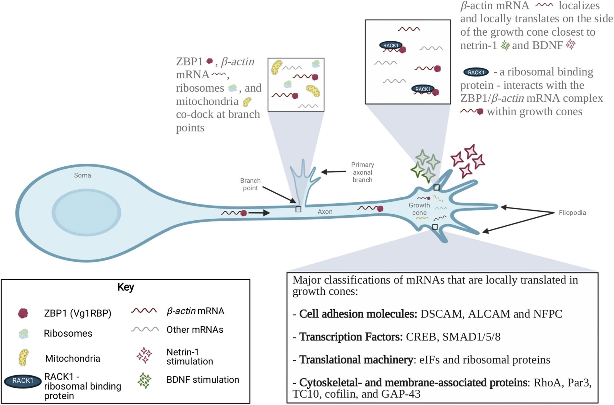 Localization of mRNAs and RBPs in axons and growth cones during axon growth, guidance and branching. mRNAs localized to developing axons encode many functional classes of proteins, including cell adhesion molecules, guidance receptors, cytoskeletal components, and members of signaling cascades. The local translation complex of β-actin mRNA, ZBP1, ribosomes and mitochondria is involved in axon branching. BDNF and netrin-1 induced local translation of β-actin mRNA is also involved in axon guidance. Four major classes of mRNAs that are locally translated in growth cones are cell adhesion molecules, transcription factors, translational machinery and cytoskeletal- and membrane-associated proteins. The local translation of these proteins is a tightly regulated process that is critical for the formation of appropriate neural networks.