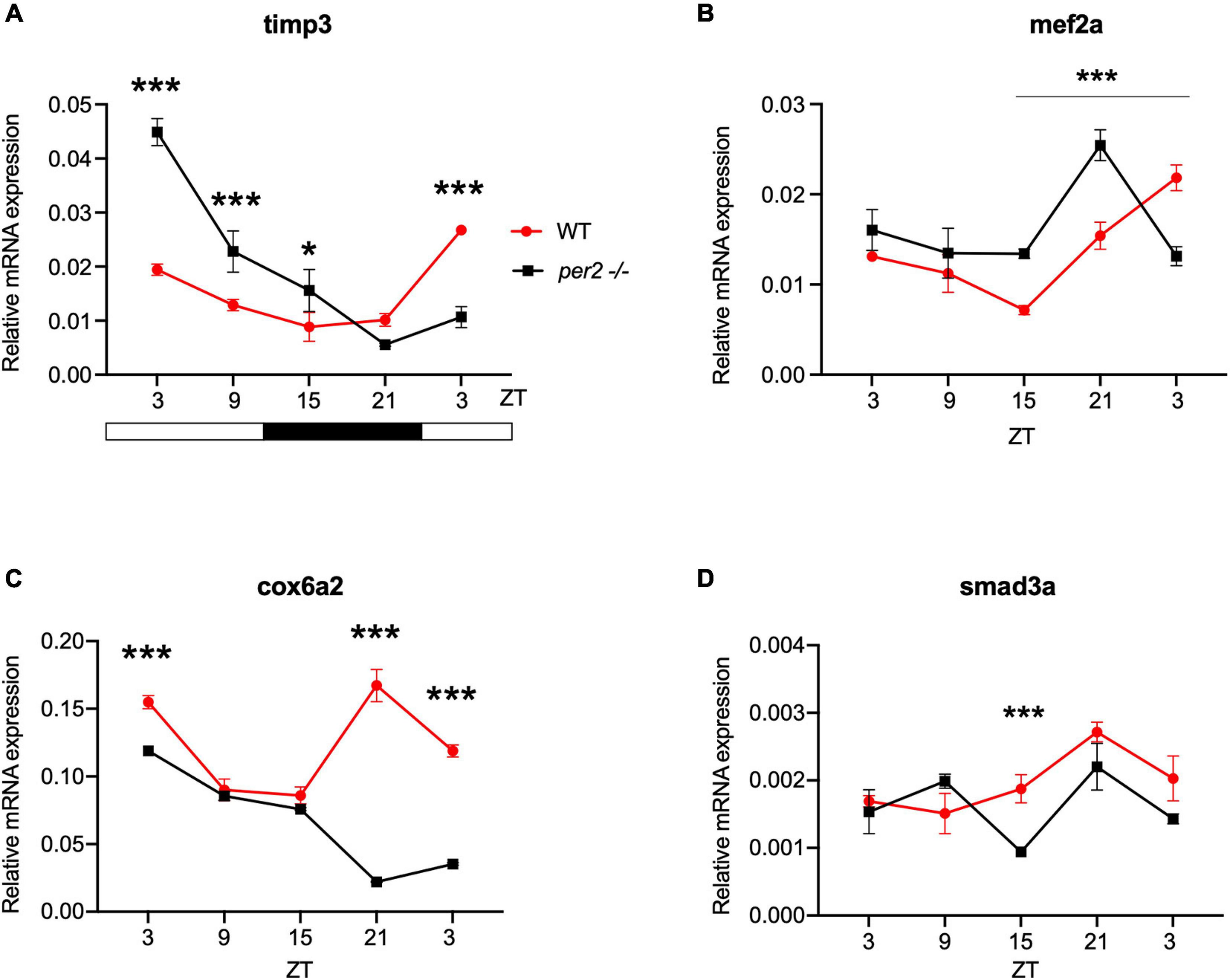 Per2 knockout alters the rhythmic mRNA expression of clock-controlled genes in the adult zebrafish heart. qRT-PCR analysis of expression levels of four putative CCGs (A)timp3, (B)mef2a, (C)cox6a2, and (D)smad3a in WT and per2 KO heart tissues. Sets (n = 3) of 4 WT and per2 KO fish (each set containing two males and two females) were maintained under LD cycle (14 h light-10 h dark) conditions, hearts were dissected and pooled for RNA extraction at 6-h intervals during a sampling window of 24 h. Mean mRNA relative expression ± SD is plotted on the y-axis; zeitgeber time (ZT) is plotted on the x-axis. Zeitgeber times are indicated for each sample. ZT0 corresponds to lights-on, ZT14 to lights-off. A change in rhythm was observed for timp3, cox6a2, mef2a, and smad3a, as determined by a significant ANOVA Genotype × Time interaction effect for all genes (p < 0.01, see Table 1). Asterisks represent levels of significance in comparing the two genotypes at each time point individually, corrected by Sidak’s method (***p < 0.001, *p < 0.05).