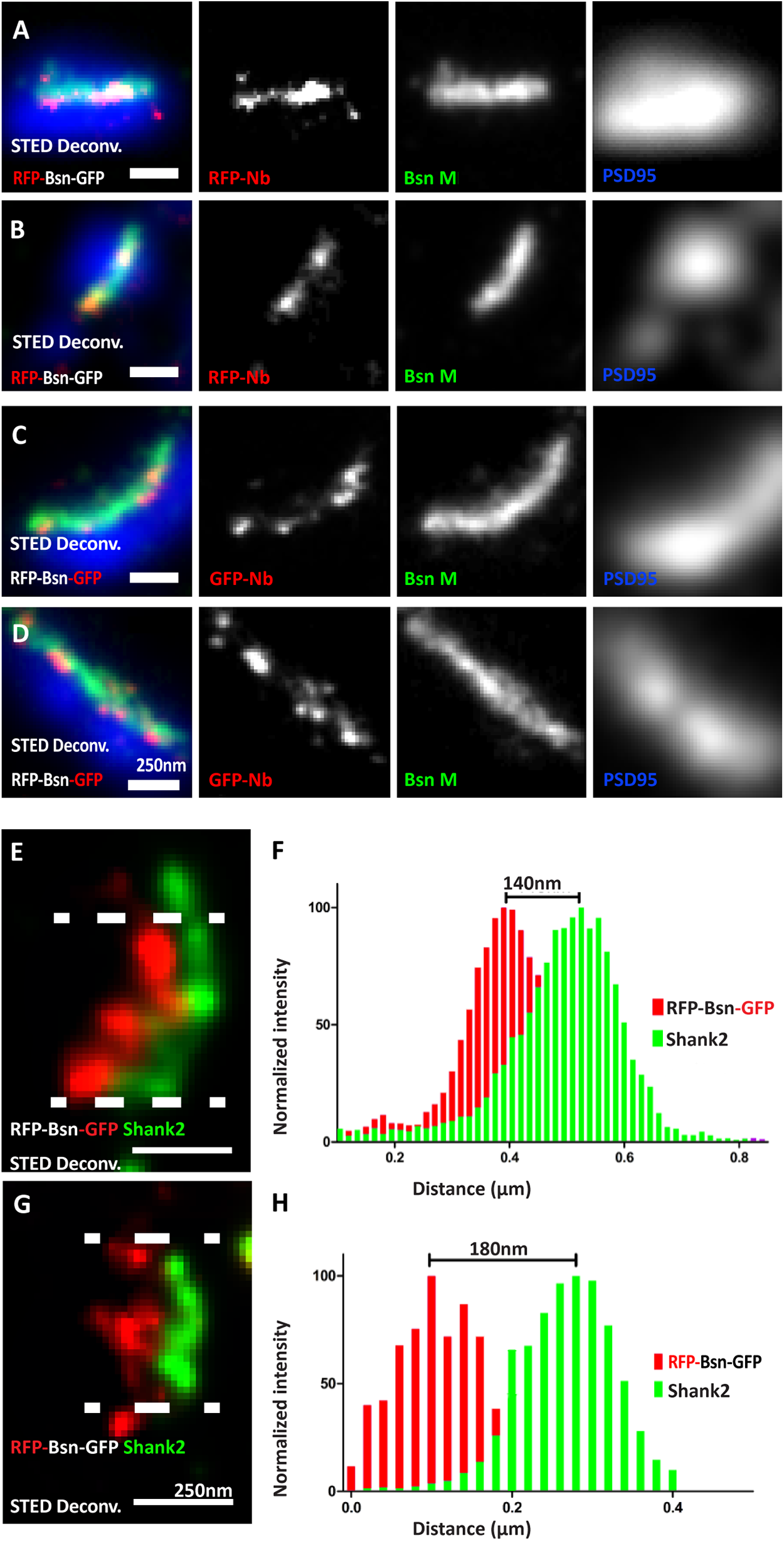 Visualizing the termini of full-length mRFP-Bassoon-mEGFP and its orientation with nanobodies at mature synaptic sites. Day in vitro 14 mass hippocampal cultures transfected with the mRFP-Bassoon-mEGFP construct and imaged using two-color STED microscopy. The construct was visualized at synaptic sites with postsynaptic scaffold markers PSD95 and Shank2, using either the RFP-nanobody-Atto594 to visualize the RFP tag and the N-terminus of the Bassoon construct (A,B,G)/the GFP-nanobody-Atto594 to visualize the GFP tag and the C-terminus of the Bassoon construct (C–E). Panels (A–D) are two-color-STED deconvolved (Deconv.) images of triple-color staining that label the endogenous presynaptic Bassoon signals with a traditional monoclonal antibody, nanoclusters of nanobody signals within the endogenous presynaptic Bassoon signals, and postsynaptic scaffold marker PSD95 (in a confocal mode). Panels (E,G) show the localization of nanobody-labeled C- and N-termini of mRFP-Bassoon-mEGFP and Shank2 in side-view images of its synapses. Distribution of localization points within a 350-nm thick line profiles at the center of the synapse (as shown by the area within the dashed lines) was measured, fit with gaussian distributions, and is plotted in panels (F) (C-terminus of tagged Bassoon and Shank2) and (H) (N-terminus of tagged Bassoon and Shank2). The distance between centroids of the two Gaussians defines the Bassoon-Shank2 distances. N = 10 transfected neurons (A–H) from which 14 (E,F) and 13 (G,H) side-view synapses analyzed as technical replicates. N = 3 separately transfected neuronal cultures/independent experiments (A–H). Scale bars 250 nm (A–G).