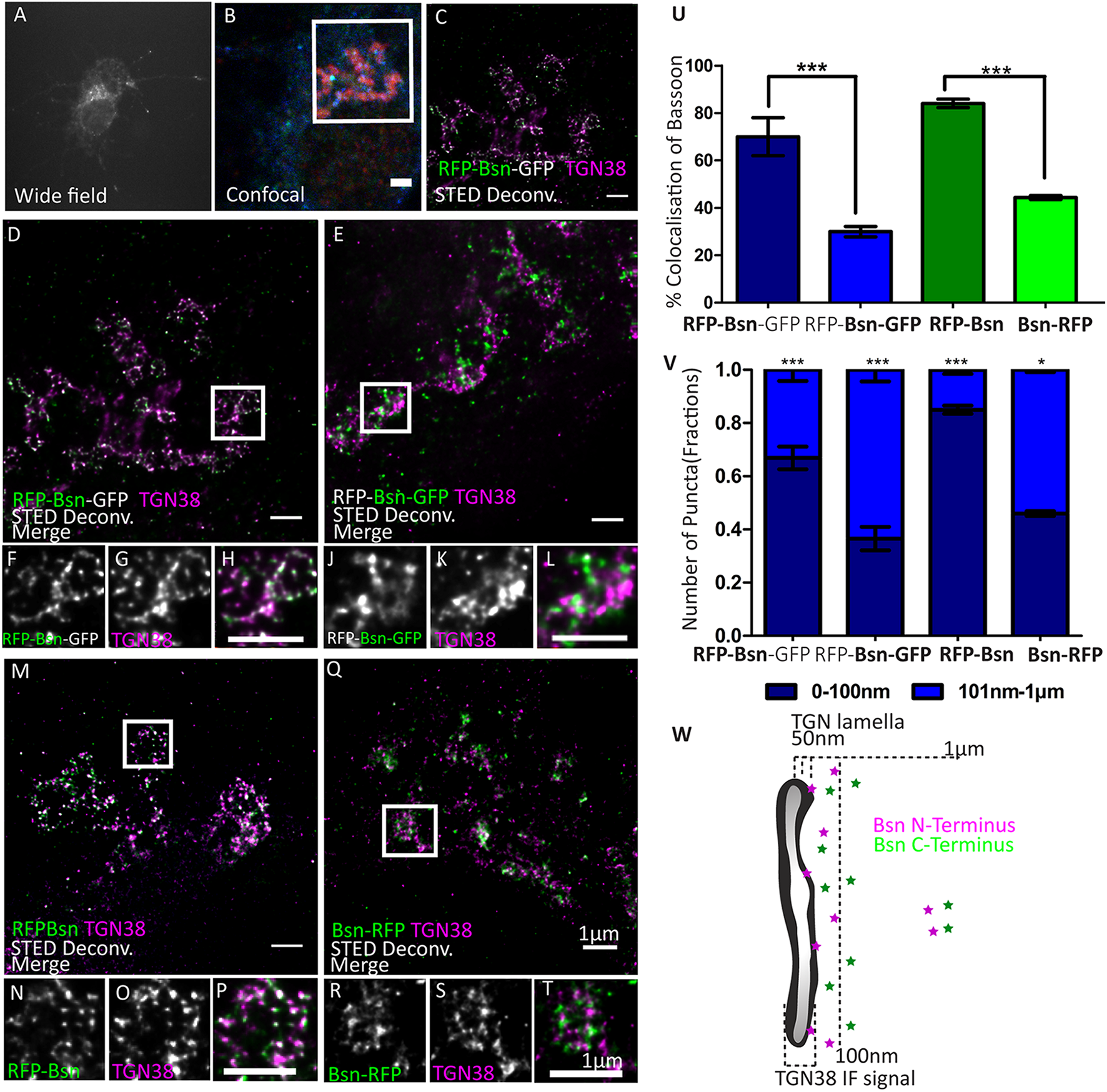 Orientation of double- and single-tagged Bassoon constructs at the trans-Golgi network marker TGN38. Day in vitro 7 hippocampal neurons transfected with double- (A–L) and single-tagged (M–T) full-length Bassoon are immunostained with the trans-Golgi network marker TGN38 and an RFP-nanobody-Atto594 to visualize the RFP tag (A–H,M–P,Q–T)/a GFP-nanobody-Atto594 to visualize the GFP tag (I–M). The experimental schematic (panels A–C) demonstrates the acquisition of two-color STED images wherein the wide-field overview of the transfected neuron (A), its corresponding confocal overview of the soma, with GFP autofluorescence in blue, (B) and a 10-μm-X-10-μm inset scanned in a STED mode to visualize the N–terminus of the constructs (C,D,M) and C–terminus (I,Q). Merged and single-channel views of the zoom images of (E–G,I–K,M–O,Q–S) are representations of the white ROIs in the STED images (D,I,M,Q), respectively. (U) Represents the colocalization quantification, and (V) represents the allocation quantification at and away from TGN lamella, i.e., 0–100 nm or 101 nm–1 μm, respectively. Data are represented as mean ± SEM, N = 10 transfected neuronal somas/condition imaged (E–V). N = 2 separately transfected neuronal cultures/independent experiments (E–V).*p ≤ 0.05 and ***p ≤ 0.001. (W) Is a schematic representation of the proposed distribution of N- and C-terminal Bassoon immunosignals at the TGN. Scale bars 2 μm (B) and 1 μm (C–T).