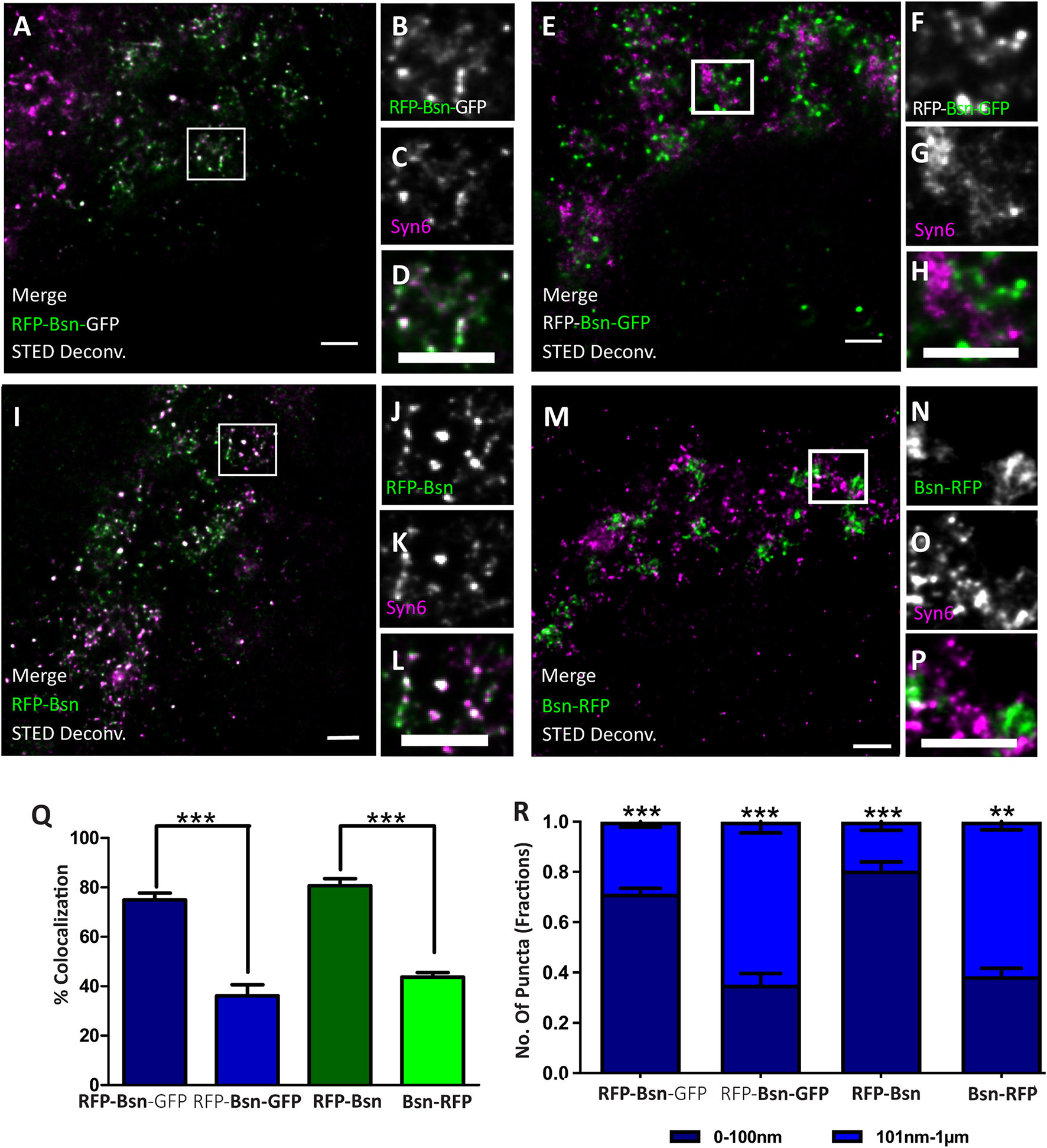 Orientation of double- and single-tagged Bassoon constructs at the trans-Golgi network marker Syntaxin 6 (Syn6). Transfected DIV7 hippocampal neurons immunostained for either one or both termini of full-length Bassoon with RFP-nanobody-Atto594/GFP-nanobody-Atto647 and the Syn6 marker. Two-color, deconvolved, 10-μm-X-10-μm STED images and their ROI zooms show double-tagged and single-tagged Bassoon constructs in panels (A–D,I–L) (of which the N–termini of constructs were imaged) and panels (E–H,M–P) (of which the C–termini of the constructs were imaged), respectively. Graph (Q) quantifies the amount of Bassoon colocalization with Syn6, and graph (R) quantifies the Bassoon signal allocations at and away from TGN38 lamella, i.e., 0–100 nm or 101 nm–1 μm, respectively. Data are represented as mean ± SEM, N = 10 transfected neuronal somas/condition imaged and N = 2 separate transfected neuronal cultures/independent experiments (A–R). Statistically tested with a Tukey’s multiple comparison **p ≤ 0.01 and ***p ≤ 0.001. Scale bars 1 μm (A–P).