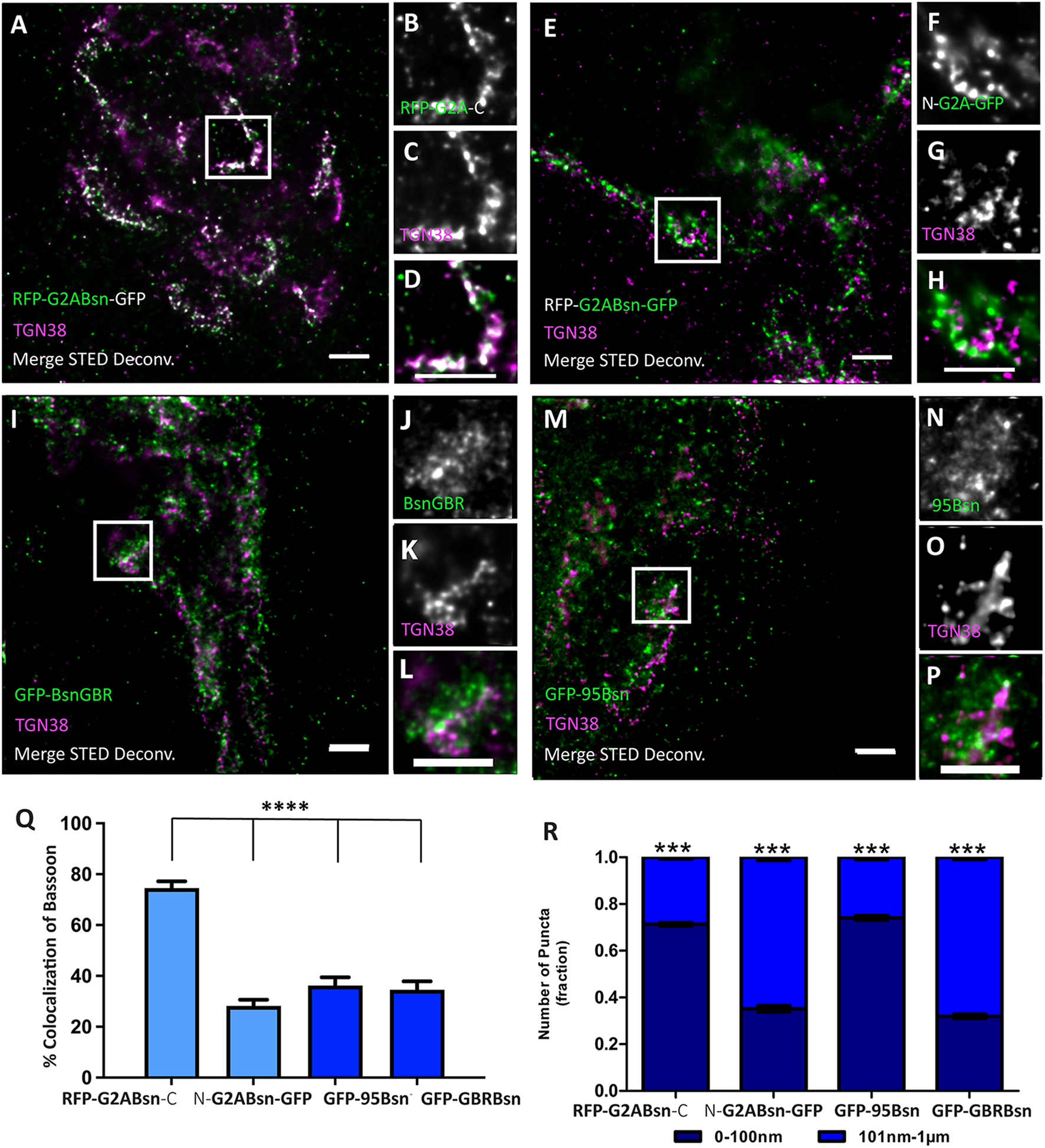Orientation of deletion constructs of Bassoon at the trans-Golgi network. Day in vitro 7 hippocampal neurons transfected with tagged Bassoon deletion constructs a myristoyl group-deficient G2A-mRFP-Bsn-mEGFP (A–H), Bassoon’s N–terminus, i.e., (95–3938) 95-Bsn construct (I–L), and Bassoon’s N– and C–termini (2088–2038), i.e., Bsn-GBR construct (M–P), were visualized with GFP-nanobody-Atto647/RFP-nanobody-Atto594 and a TGN38 marker. Insets of the two-color STED-deconvolved images in (A,E,I,M) are represented in panels (B–D,F–H,J–L,N–P), respectively. Graphs (Q,R) quantify the colocalization and signal allocations of Bassoon at the TGN38, respectively. Data are represented as mean ± SEM, N = 8 transfected neuronal somas/condition imaged and N = 2 separate transfected neuronal cultures/independent experiments (A–R). Statistically tested with a Tukey’s multiple comparison test. ***p ≤ 0.001 and **** p ≤ 0.0001. Scale bars 1 μm (A–P).