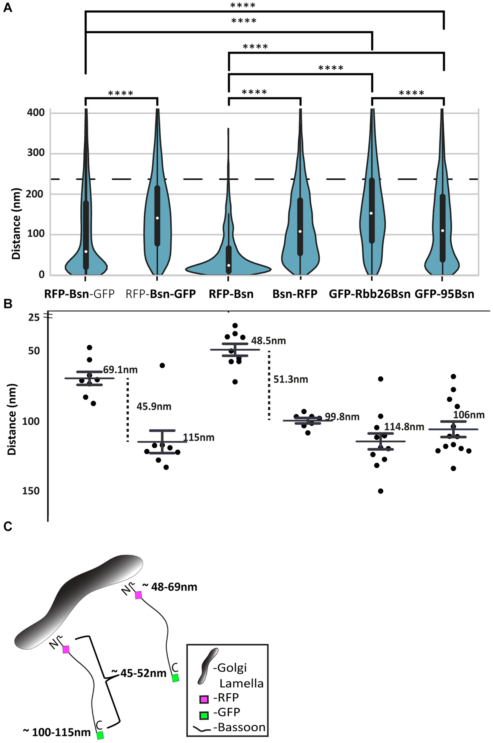 Distribution and average distances of all full-length and mutant Bassoon signals from the TGN38 reference marker. Bean plots in panel (A) display all signal distributions of single- and double-tagged full-length and deletion constructs of Bassoon from their nearest TGN38 marker. The light gray lines within each individual bean plot show individual observations of Bassoon signals. The blue ROI represents the 220-nm range that corresponds to 75% of the total Bassoon signals oriented around the TGN lamella (A). Pairs of distributions were compared by a Kolmogorov–Smirnov test ****p ≤ 0.001. The average distances of the Bassoon tags of all five constructs within the 200-nm distance range are plotted in (B). (C) Is a schematic diagram that shows the average distance N and C-termini of full-length Bassoon molecules possess at the TGN lamella.