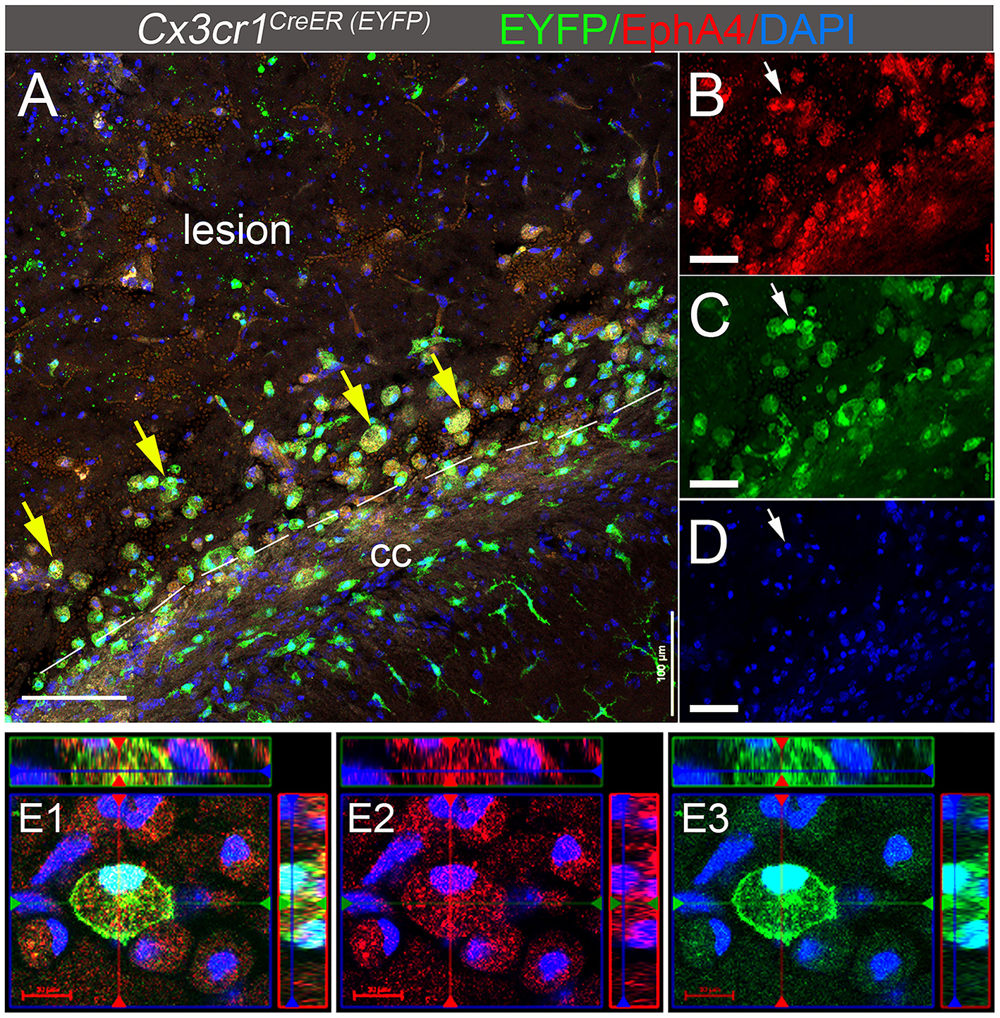 EphA4 is upregulated on Cx3cr1-expressing cells in the peri-lesion 3 days post CCI injury. (A–D) Representative confocal images at max z-projection for immunohistochemical analysis for EphA4 (red), EYFP in Cx3cr1-expressing cells (green), and DAPI (blue) at 3 dpi in the ipsilateral cortex of Cx3cr1CreER/+mice. CCI injury increased EphA4 expression in cx3cr1+ cells (arrows) in the peri-lesion areas. (E1–E3) Co-localization of EphA4 and EYFP in amoeboid-shaped microglia and/or PDM. Scale bar: (A) 100 μm; (B–D) 50 μm and (E1–E3) 20 μm.