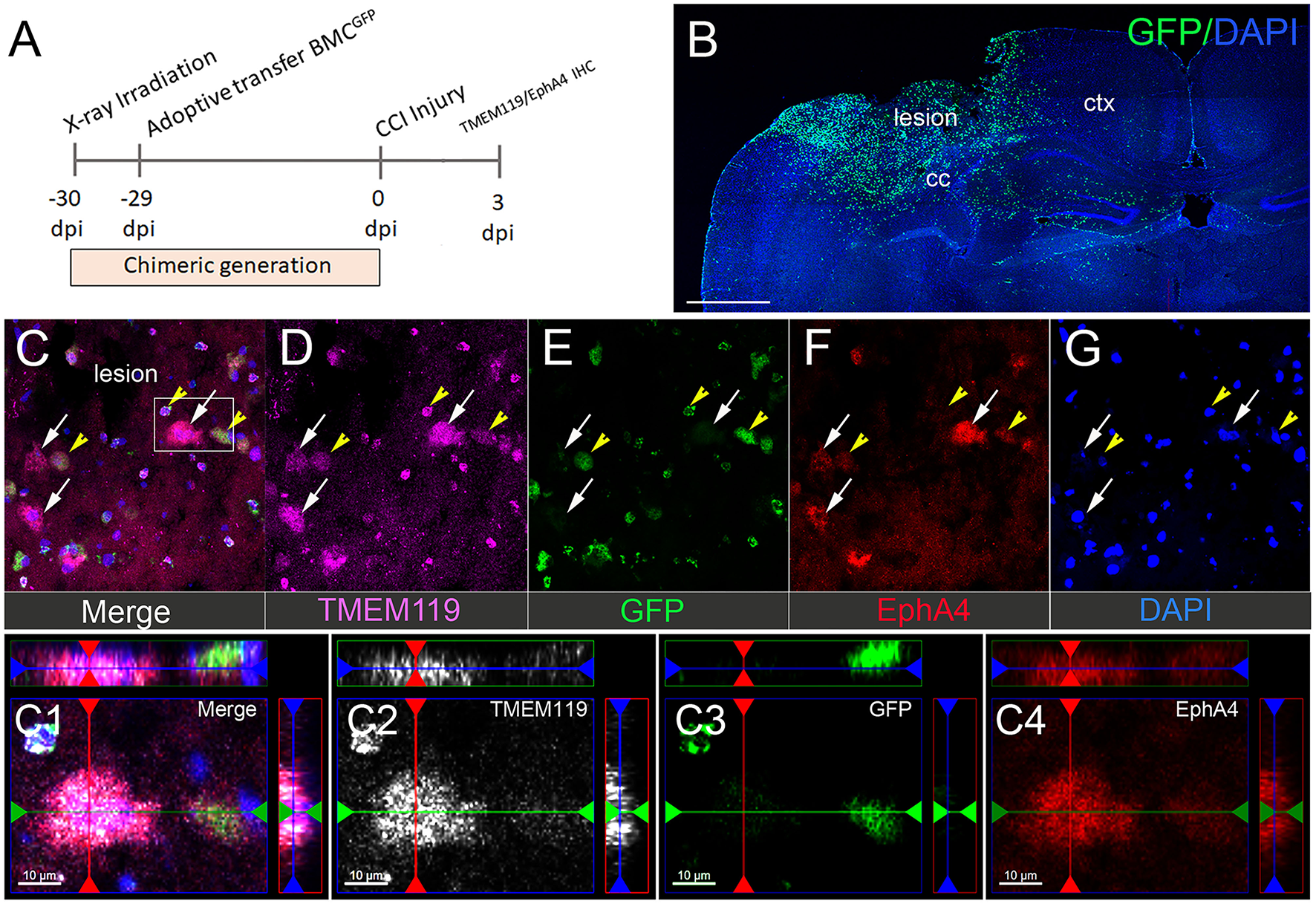 Microglial EphA4 is upregulated in the damaged cortex after CCI injury. (A) Timeline for generation of GFP bone marrow chimeric mice and CCI injury. Mice were euthanized 3 dpi, and brain sections were used for IHC analysis of TMEM119 and EphA4. (B) Representative confocal images for peripheral-derived immune cells (GFP), infiltrating the ipsilateral injured cortex. (C–G) Representative images of TMEM119 (purple) and EphA4 (red). EphA4 is expressed on amoeboid-resident microglia (white arrow, EphA4+/GFP−/TMEM119+) as well as peripheral-derived GFP immune cells, which also express TMEM119 (yellow arrowhead, EphA4+/GFP+/TMEM119+). (C1–C4) Representative images showing the colocalization of TMEM119 (white) and EphA4 (red) in GFP− microglia. Scale bar in (B) 1,000 μm; (C1–C4) 10 μm.