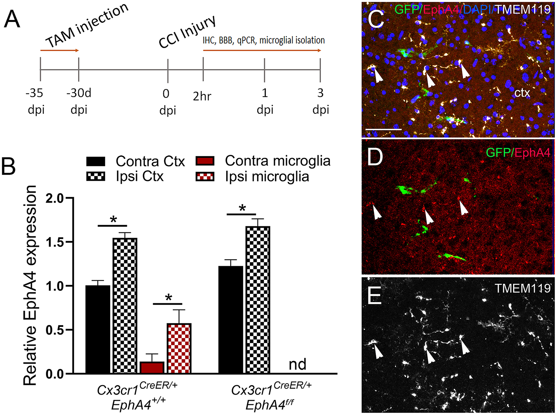 EphA4 expression in microglia at 2 h post-CCI injury. (A)Cx3cr1CreER/creEREphA4+/+, Cx3cr1CreER/+EphA4+/+, and Cx3cr1CreER/+EphA4f/f mice were intraperitoneally injected with five daily doses of tamoxifen (100 mg/kg) and then subjected to CCI injury 30 days after the last injection. Microglia were isolated from ipsilateral and contralateral cortices for qRT-PCR analysis at 2 h. (B) Relative EphA4 mRNA expression was measured in isolated microglia and non-adherent cells from ipsilateral (ipsi) and contralateral (contra) cortices (Ctx) at 2 h. N = 5, *p < 0.05, significant difference between the designated groups; nd, not detected. (C–E) Representative confocal images for IHC analysis of TMEM119 (white) and EphA4 (red) in GFP bone marrow chimeric WT mice, showing increased EphA4 expression in resident microglia (white arrowhead, EphA4+GFP−TMEM119+). Scale bar = 100 μm.