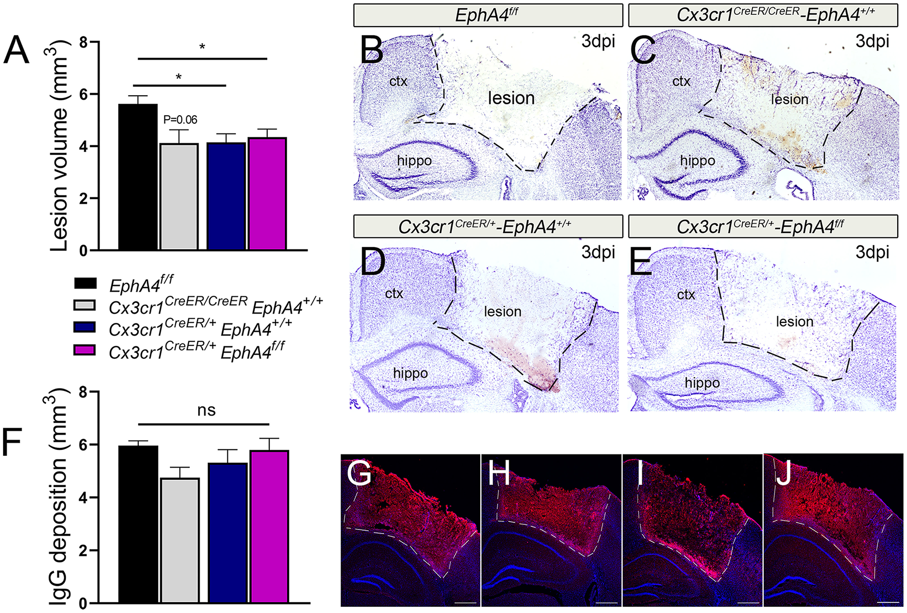 Conditional deletion of microglial EphA4 does not affect acute tissue damage or BBB disruption, following CCI injury. (A) Lesion volume (mm3) 3 dpi was estimated in the ipsilateral cortex of five Nisslstained serial coronal sections of each brain using Cavalieri Estimator from StereoInvestigator. (B–E) Representative mosaic images for the ipsilateral cortices of Nissl-stained sections taken at 4× magnification. (F) Immunoglobulin G (IgG) deposition volume was measured at 3 dpi in the ipsilateral cortex of five serial coronal sections of each brain using Cavalieri Estimator from StereoInvestigator. (G–J) Representative confocal images for the ipsilateral cortices of anti-mouse IgG-stained sections (red) taken at 4× magnification. N = 5–15, *p < 0.05, significant difference between the designated groups. ns, nonsignificant difference was observed.