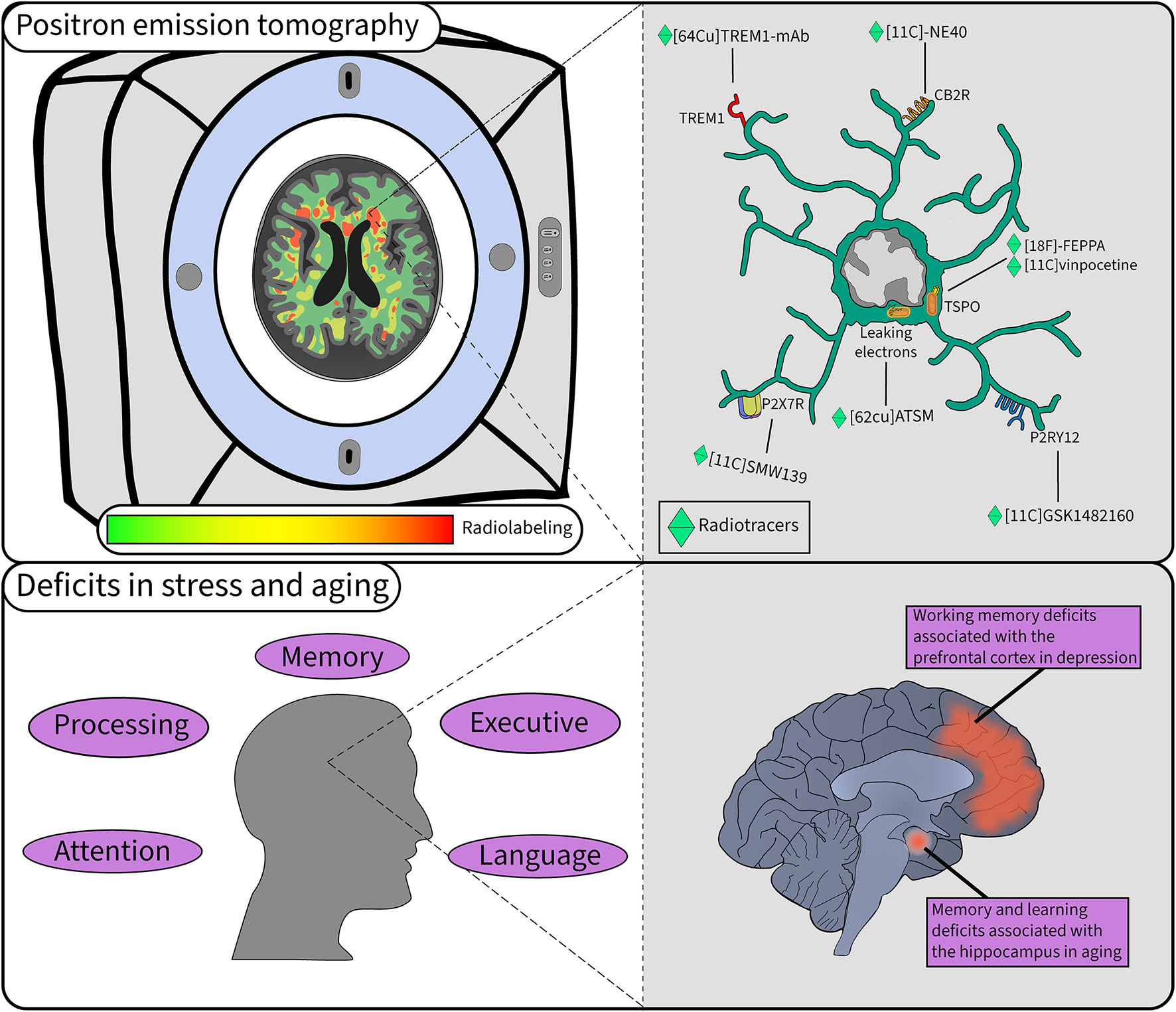Microglial study using PET in stress and aging. PET is a widely used technique when investigating microglial activity in pathology. In the top left, microglial labeling of radiotracers is quantified to provide insight into their function in the human brain in a non-invasive manner. In the top right a myriad of tracers provide different information on the function of microglia in the brain. The bottom left panel highlights some of the cognitive deficits observed in aging that can be accelerated with chronic stress. The bottom right panel illustrates the key regions and deficits associated with stress and aging.