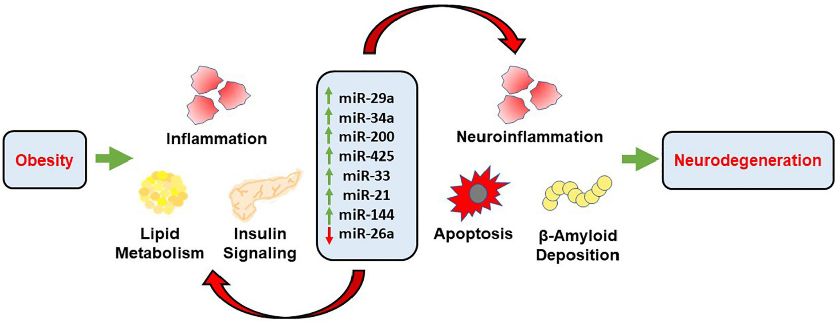 This review aims to highlight the mechanistic role of eight microRNAs involved in the pathogenic link between obesity and its associated comorbidities, such as type 2 diabetes and cardiovascular disease, and neurodegenerative disorders characterized by cognitive decline. It has been demonstrated that obesity is characterized with increased levels of oxidative stress and inflammation that is the direct result of increased lipid accumulation. This state of metabolic dysregulation favors pathophysiological mechanisms that may lead to CNS neurodegeneration and cognitive decline (Fischer and Maier, 2015). These pathophysiological mechanisms propagate the development of neurodegenerative diseases through the generation of oxidative stress and inflammation that is damaging to neuronal tissue. There may be a myriad of mechanisms, but the one this review aims to isolate and further identify is through the generation of aberrant levels of miRNAs involved in key cellular functions. Some of these functions are glucose and lipid metabolism, molecular signaling pathways, and apoptotic pathways. When these functions are perturbed, it can lead to further development of oxidative stress, inflammation, and apoptosis (Figure 2). This continual cycle promotes the further development of pro-inflammatory markers that wreak cellular havoc on physiologically homeostatic systems. We also investigated the efficacy of dietary interventions on the disruption of these cyclic pathways that favor the pro-inflammatory state. As a non-invasive and inexpensive remedy, dietary intervention plays an important role in the amelioration of the obese-phenotype and development of its associated comorbidities. The regression and termination of the development of the obese phenotype through dietary interventions may even have important ramifications in light of CNS pathologies that are directly linked to the obese state. It is thought that the modification of diet can slow pro-inflammatory pathways to the point that the CNS is not receiving any harmful overflow that may lead to the development of neurodegenerative associated cognitive decline.