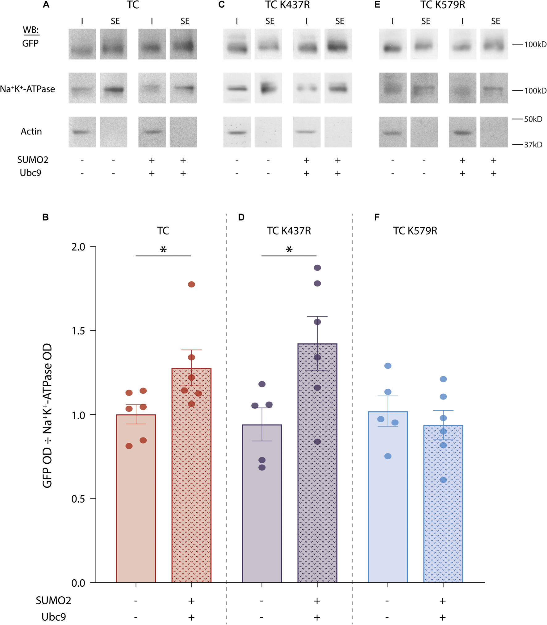 SUMOylation of Kv4.2g at K579 increases surface expression. SUMOylation was (+) or was not (–) increased in HEK cells expressing wild-type TC, TC K437R, or TC K579R. Surface proteins were biotinylated, cells were lysed, and surface expressed fractions (SE) were isolated using NeutrAvidin resin. Proteins that did not bind to the NeutrAvidin resin were considered to be the intracellular fraction (I). (A,C,E) Western blots containing SE and I from one representative experiment for each treatment group. The upper portion of the blot (above 50 kD) was used to visualize Kv4.2g with anti-GFP; it was then stripped and re-probed with anti-Na+/K+-ATPase. The lower portion of the blot (below 50 kD) was probed for actin. (B,D,F) Bar graphs showing the mean ± SEM Kv4.2g surface expression [SE Kv4.2g OD/SE Na+/K+-ATPase OD]. Each dot is one independent experiment. Asterisk, significantly different. TC: control, 1.0 ± 0.1 vs. SUMO2 + Ubc9, 1.3 ± 0.1, t-test p = 0.046; TC K437R: control, 0.9 ± 0.1 vs. SUMO2 + Ubc9, 1.4 ± 0.2, t-test p = 0.037; TC K579R: control, 1.0 ± 0.1 vs. SUMO2 + Ubc9, 0.9 ± 0.1, t-test p = 0.528.