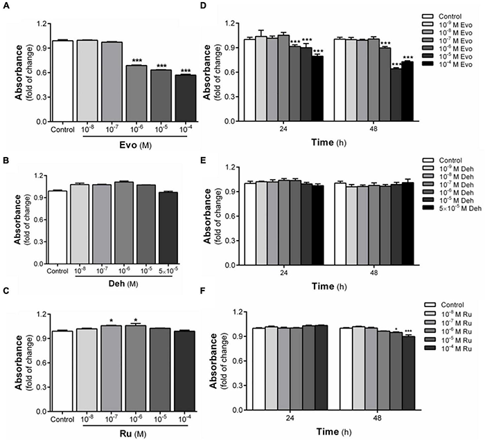 Cytotoxicity of three bioactive substances in Evodia rutaecarpa. (A) Effect of evodiamine on cell viability of CBG2.8D cells; (B) Effect of dehydroaevodiamine on cell viability of CBG2.8D cells; (C) Effect of rutaecarpine on cell viability of CBG2.8D cells; (D) Effect of evodiamine on cell viability of U87 cells; (E) Effect of dehydroaevodiamine on cell viability of U87 cells; (F) Effect of rutaecarpine on cell viability of U87 cells was determined by CCK8 assay. *p < 0.05, ***p < 0.001 compared with control group. All values are fold of control that was treated with the solvent and represent the mean ± SEM (n = 3). SEM, standard error of the mean; Evo, evodiamine; Deh, dehydroaevodiamine; Ru, rutaecarpine.