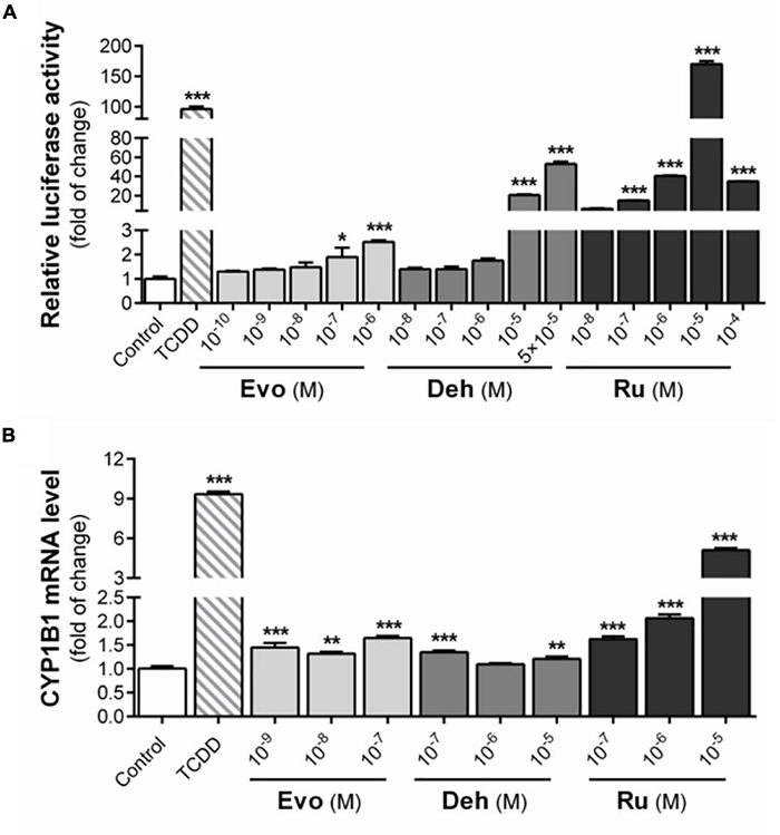 Activation of AhR signaling pathway by three bioactive substances in Evodia rutaecarpa. (A) Effect of evodiamine, dehydroaevodiamine, and rutaecarpine on activation of AhR after 24 h treatment was determined by luciferase reporter assay in CBG2.8D cells. (B) Effect of evodiamine, dehydroaevodiamine, and rutaecarpine on the mRNA expression of CYP1B1 in U87 cells after 48 h treatment were determined by qPCR analysis. GAPDH was used as an internal control for quantification. *p < 0.05, ** p < 0.01, ***p < 0.001 compared with control group. All values are fold of control that was treated with the solvent and represent the mean ± SEM (n = 3). SEM, standard error of the mean; Evo, evodiamine; Deh, dehydroaevodiamine; Ru, rutaecarpine.
