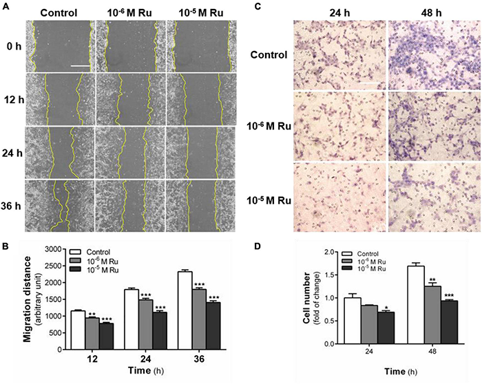 Effect of rutaecarpine on the migration of U87 cells. Wound healing assay and transwell migration analysis were used to analyze U87 cells’ migration ability. (A) Typical images of wound healing assay were taken at 0, 12, 24, and 36 h about different treatment groups. Scale bar = 0.5 mm. (B) Quantitative data graph of wound healing assay. After 36 h treatment with 10–6 and 10–5 M rutaecarpine or 0.1% DMSO, the distance of migration was counted. (C) Typical images of transwell migration analysis were taken at 24 and 48 h about different treatment groups. Scale bar = 0.1 mm. (D) Quantitative data graph of transwell migration analysis after 24 h and 48 h treatment with 10–6 and 10–5 M rutaecarpine or 0.1% DMSO, the distance of migration was counted. *p < 0.05, **p < 0.01, ***p < 0.001 compared with control group. All values are fold of control that was treated with the solvent and represent the mean ± SEM (n = 3). SEM, standard error of the mean; Ru, rutaecarpine.