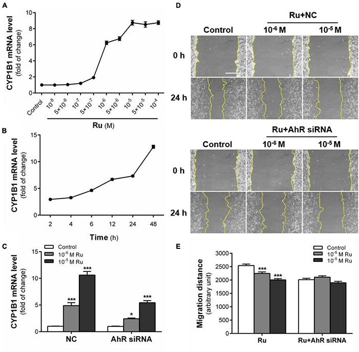 AhR signaling pathway mediates the inhibition of rutaecarpine on U87 cells migration. (A) Dose relationship between rutaecarpine with AhR signaling pathway activation after 48 h treatment with 10–8–10–4 M rutaecarpine or 0.1% DMSO. (B) Time relationship of rutaecarpine with AhR signaling pathway activation after 2, 4, 6, 12 24, 48 h treatment with 10–4 M rutaecarpine. (C) After 48 h treatment with rutaecarpine or 0.1% DMSO together with or without AhR siRNA pre-treatment, the mRNA expression of CYP1B1 in U87 cells. The mRNA expression of CYP1B1 in U87 cells was determined by qPCR analysis. GAPDH was used as an internal control for quantification. A wound healing assay was used to analyze the effect of AhR signaling pathway activation on U87 cells migration. AhR mRNA interference was treated as indicated. (D) Typical images of wound healing assay were taken at 0 and 24 h about different treatment groups. Scale bar = 0.5 mm. (E) Quantitative data graph of wound healing assay. After 24 h treatment with 10–6 and 10–5 M rutaecarpine or 0.1% DMSO, the distance of migration was counted. *p < 0.05, ***p < 0.001 compared with control group. All values are fold of control that was treated with the solvent and represent the mean ± SEM (n = 3). SEM, standard error of the mean; Ru, rutaecarpine; NC, non-targeted siRNA.