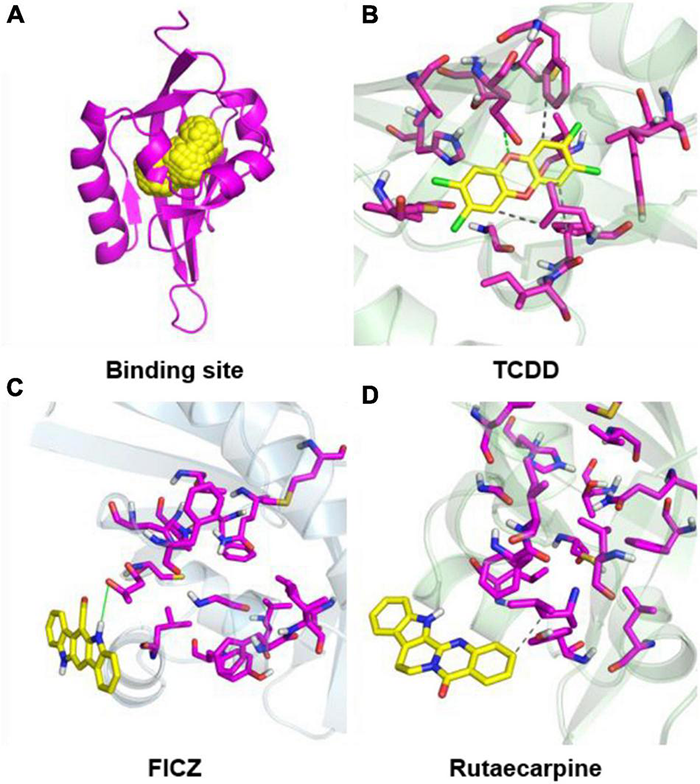Molecular docking configurations of TCDD, FICZ, and rutaecarpine with AhR. (A) AhR_HUMAN binding site map. The secondary structure of the protein was shown by magenta bands and the binding sites were shown by yellow spheres. (B) Docking of TCDD into the AhR binding pocket. (C) Docking of FICZ with the AhR protein model. (D) Docking of rutaecarpine with the AhR protein model.