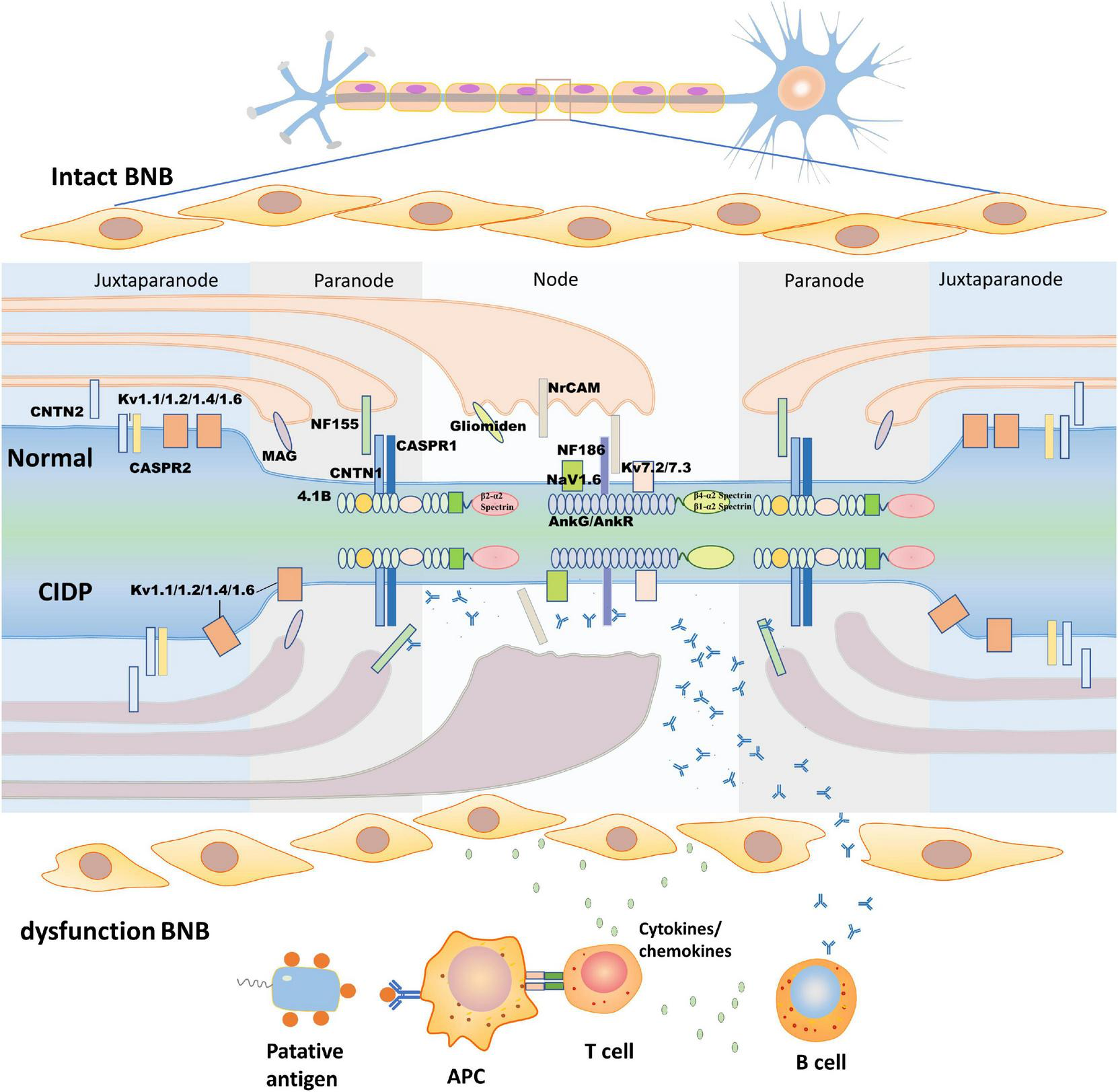 The BNB dysfunction is the first step in the pathological cascade of CIDP. Both the cellular and humoral immunities are involved in the pathogenesis of CIDP. Previous studies have demonstrated that the filtration of autoreactive T-cells, macrophages, and cytokines leads to dysfunction of the BNB, which makes it accessible to antibodies in circulation (Figure 1; Lonigro and Devaux, 2009). A study showed that injection of anti-NF antibodies from patients with CIDP to the experimental autoimmune neuritis (EAN) model could enhance and prolong an ongoing neuritis, but injection of anti-NF antibodies to the control group is not pathogenic (Ng et al., 2012). An electrophysiology test of CIDP showed that distal and F-wave latencies are influenced more severely than the motor conduction velocities and compound muscle action potential amplitudes and have a high frequency of spinal root hypertrophy on MRI images, which suggest that nerve terminals, major plexuses, and spinal roots are more frequently involved in patients with anti-NF155 antibody-positive CIDP, where the BNB is anatomically absent or loose (Ogata et al., 2015; Kira, 2021). The BNB maintains nerve homeostasis by preventing the free movement of soluble proteins in the circulation into the endoneurium microenvironment under normal physiological conditions. In the condition of dysfunction of the BNB (e.g., the BNB is congenitally absent or damaged by in situ/systematic inflammation), molecules involved in Schwann cell-axon interaction, such as NF, CNTN1, and CASPR1, are accessible to the immune system and act as putative antigens, which are presented by antigen-presenting cells through the expression of the costimulatory molecules CD80 and CD86 to T cells; in effect, T cells activate and release cytokines, including interleukin-4 (IL-4) and IL-6 (Kiefer et al., 2000; Murata and Dalakas, 2000; Hu et al., 2007). These inflammatory mediators, which increase in both the cerebrospinal fluid and serum in patients with CIDP, not only activate B cells to produce autoantibodies, but also increase the permeability of the BNB, which progressively deteriorates the local inflammatory microenvironment and assists T cells to pass through the BNB easily, resulting in further severe damage to the BNB in a vicious cycle (Kieseier et al., 2002; Chi et al., 2008). The infiltrating inflammatory cells were identified by sural nerve biopsies in CIDP including macrophages, CD8+ T cells, and CD4+ T cells (Maimone et al., 1993; Schmidt et al., 1996; Mahad et al., 2002; Schneider-Hohendorf et al., 2012). Resident and recruited macrophages, activated by cytokines produced from T cells, invade the myelin fiber via their Fc receptor, causing macrophage-mediated demyelination, which are the predominant infiltrating inflammatory cells in patients with CIDP. With dysfunction of the BNB, cytokines/chemokines induce cell infiltration into the nerve microenvironment and make antibodies accessible to the antigen targets of axons or Schwann cells. However, previous studies revealed that biopsied sural nerves from two anti-NF155 antibody-positive patients with CIDP demonstrated subperineurial edema and occasional paranodal demyelination, but no vasculitis, inflammatory cell infiltrates, or onion bulbs (Ogata et al., 2015; Koike et al., 2017). Another study showed that large myelinated fiber loss without cellular infiltration was observed in anti-NF186 antibody-positive patients with CIDP (Pascual-Goñi et al., 2019), which probably indicates that humoral immunity, not cellular immunity, is the primary mechanism in anti-NF antibody-positive CIDP.