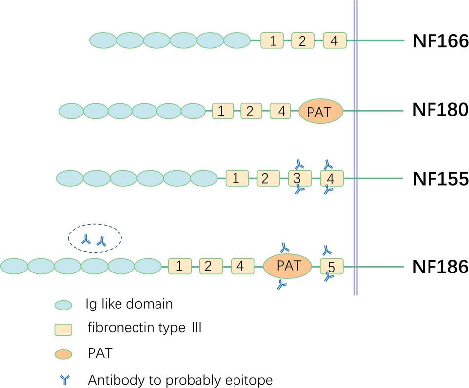 Neurofascin, a neural-cell surface protein, is part of the L1 group of the immunoglobulin superfamily, including L1, close homolog of L1 (CHL1), and NrCAM (Liu et al., 2011). Different polypeptides of 155, 166, 180, and 186 kDa are produced by alternative splicing in the isoform of NF (Kriebel et al., 2012). All are composed of six Ig-like domains, three to four fibronectin type III (FNIII), the proline-, alanine-, threonine (PAT)-rich domain (also referred to as mucin-like domain), and a transmembrane domain (Hassel et al., 1997). The specific function of each domain in different isoforms of NFs is not clear so far and further investigation is necessary in the future. NF180 and NF166 are expressed in the surface of immature neurons. NF166 is composed of six Ig-like domains, FNIII domains 1, 2, and 4 without the PAT domain, and is expressed in the developing chick dorsal root ganglia. NF180 is different from NF166 in terms of its addition to the composition of the PAT domain. Evidence has shown that the NF180 isoform is expressed in the embryonic brain and during early development in the rat brain (Hassel et al., 1997; Burkarth et al., 2007). However, the specific functions of NF180 and NF 166 remain unclear and additional investigation is needed. The difference between NF155 and NF186 relies on the extracellular domains. NF155 carries fibronectin type 3 (FN3); however, NF186 lacks this domain and instead has FN5 and the PAT domain between FN4 and FN5. NF is indispensable for the intact structure and function of axons and the structures of nodes and paranodes in mice whose NF gene is knocked out and cannot be assembled properly. NaV is diffusely distributed in axons, the septate-like transverse band effect of paranode disrupts, and nerve impulses cannot be transmitted in a saltatory manner (Sherman et al., 2005). NF is also expressed in human kidney glomeruli besides the nervous system (Sistani et al., 2013), which was also verified by a study of two patients with anti-NF186 antibody-positive CIDP who presented with nephrotic syndrome in the meantime (Delmont et al., 2017).