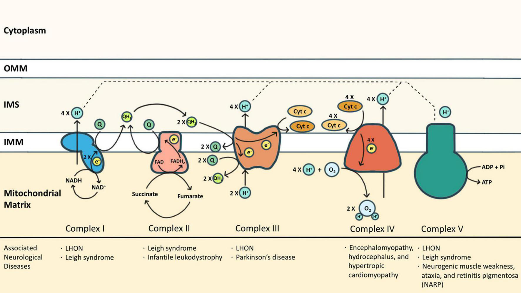 The electron transport chain (ETC) consists of complexes I (cI) to V (cV), as well as two free electron carriers, CoQ and cyt c. NADH and FADH2 donated electrons to cI and cII, respectively, causing reduction of CoQ into CoQH2. The CoQH2 is in turn oxidized by cIII where the electrons are delivered to cyt c. The reduced cyt c was then oxidized by cIV where the oxygen molecule was reduced as the terminal electron acceptor. Protons accumulated in the intermembrane space during oxidative phosphorylation via cI, cIII, and cIV, and are essential for cV to drive ATP synthesis. Some neurological diseases associated with mutations of cI-cV are listed.