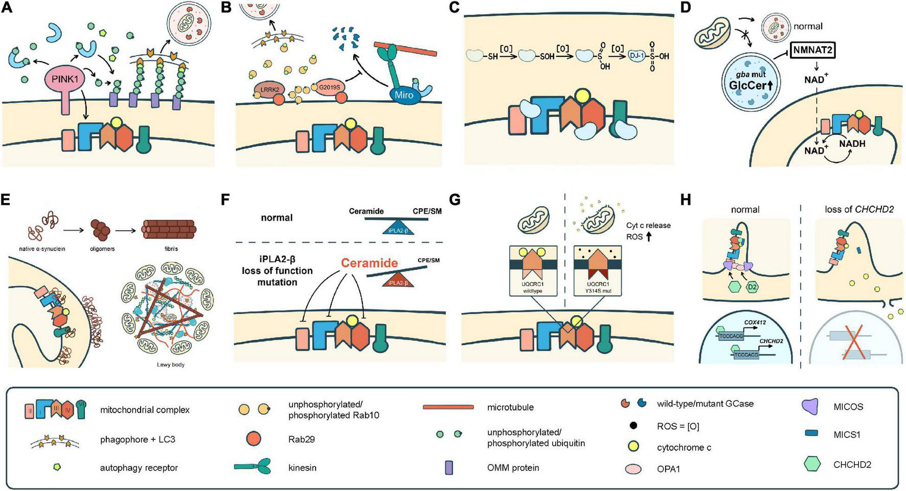 Different pathomechanisms converge on mitochondria in Parkinson’s disease. (A) PINK1 and parkin mediate mitochondrial quality control processes such as mitophagy. PINK1 is also required for phosphorylation of Ndufa10 to facilitate the reduction of ubiquinone by complex I. (B) Mutations in LRRK2 block mitophagy by preventing the degradation of Miro or by trapping Rab10 whose interaction with OPTN is pivotal for autophagy/mitophagy. (C) DJ-1 scavenges ROS through sequential oxidation at Cys106. The oxidized DJ-1 acts as a chaperone to facilitate the assembly and activities of cI, cIV, and cV. (D) Accumulation of GlcCer and other lipids in GCase mutants impairs lysosomal functions. Mutations in GCase reduces the expression of NMNAT2, resulting in a significant reduction of NAD + /NADH. (E) α-Syn monomers or oligomers interrupt the activities of cI and cV. The fibrilized α-Syn triggers Lewy body formation which sequestrates abundant mitochondria. (F) Deficits in iPLA2-β cause lipid imbalance that may interrupt ETC functions. (G) UQCRC1 is critical in cIII assembly and functions, and also prevents cyt c release. (H) CHCHD2 is a chaperone of cIV, activates COX4I2 and its own expression, complexes with MICS to prevent cyt c release, and regulates the cristae structure by stabilizing OPA1 and MICOS complex.