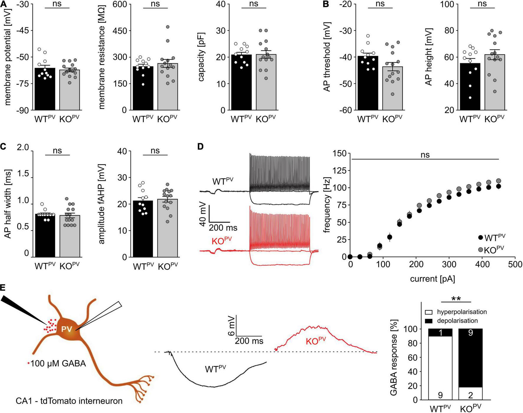 Disruption of KCC2 does not change the intrinsic excitability of PV-INs but changes the polarity of their GABA response. (A) Intrinsic properties such as resting membrane potential, membrane resistance and capacity are not altered in the absence of KCC2 (n = 11/14 cells from N = 5/6 mice; unpaired Student’s t-test; ns not significant). (B) Action potential (AP) threshold and amplitude are as well unchanged in the absence of KCC2 (n = 11/14 cells from N = 5/6 mice; unpaired Student’s t-test; ns not significant). (C) Action potential half width (left) and fast after-hyperpolarization (fAHP) (right) of PV-INs is similar in WTPV and KOPV (n = 11/14 cells from N = 5/6 mice; unpaired Student’s t-test; ns not significant). (D) The spike frequency upon current injection is not altered by disruption of KCC2 (n = 11/14 cells from N = 5/6 mice; 2-way ANOVA; Bonferroni post-test; ns not significant). (E) 100 mM GABA puffs were applied to tight seal (> 4 GΩ) patched tdTomato-labeled interneurons in the CA1 region of acute brain sections of 8-week-old WTPV and KCC2 KOPV mice (n = 10/11 cells from N = 5/6 mice; Fisher’s exact test; **p = 0.0019).