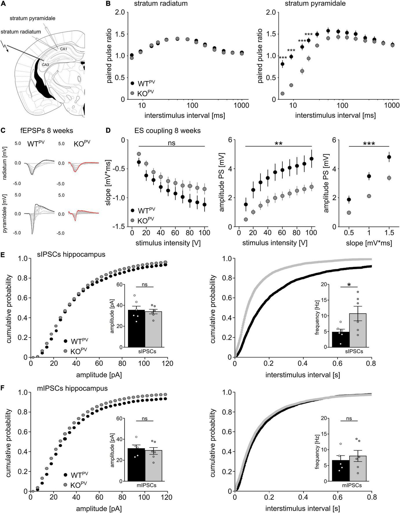 Disinhibition of PV-INs upon disruption of KCC2. (A) Position of stimulus and recording electrodes for field recordings in the stratum pyramidale and radiatum of CA1. (B) Paired-pulse ratios are reduced in the stratum pyramidale (n = 28/24 cells from N = 9/9 mice), but not in the stratum radiatum (n = 35/34 cells from N = 11/11 mice) of KCC2 KOPV mice (2-way ANOVA repeated measure; Bonferroni post-test; ***p < 0.0001). (C) Representative examples of fESPs recorded in the stratum radiatum and stratum pyramidale in KCC2 WTPV and KCC2 KOPV mice. (D) E-S-coupling is diminished in 8-week-old KCC2 KOPV mice (n = 14/17 slices from N = 4/4 mice, 2-way ANOVA repeated measure; Bonferroni post-test; **p = 0.008; ***p < 0.0001). (E) The frequency, but not the amplitude of spontaneous inhibitory post synaptic currents (sIPSCs) is increased in CA1 pyramidal neurons in KCC2 KOPV mice (N = 6/6 mice, unpaired Student’s t-test; Kolmogorov-Smirnov test; ns not significant; *p = 0.0398). (F) Miniature inhibitory postsynaptic currents (mIPSCs) upon tetrodotoxin (TTX) inhibition of spontaneous network driven events are not changed in 8-week-old KCC2 KOPV mice (N = 6/6 mice; unpaired Student’s t-test; Kolmogorov-Smirnov test; ns not significant).