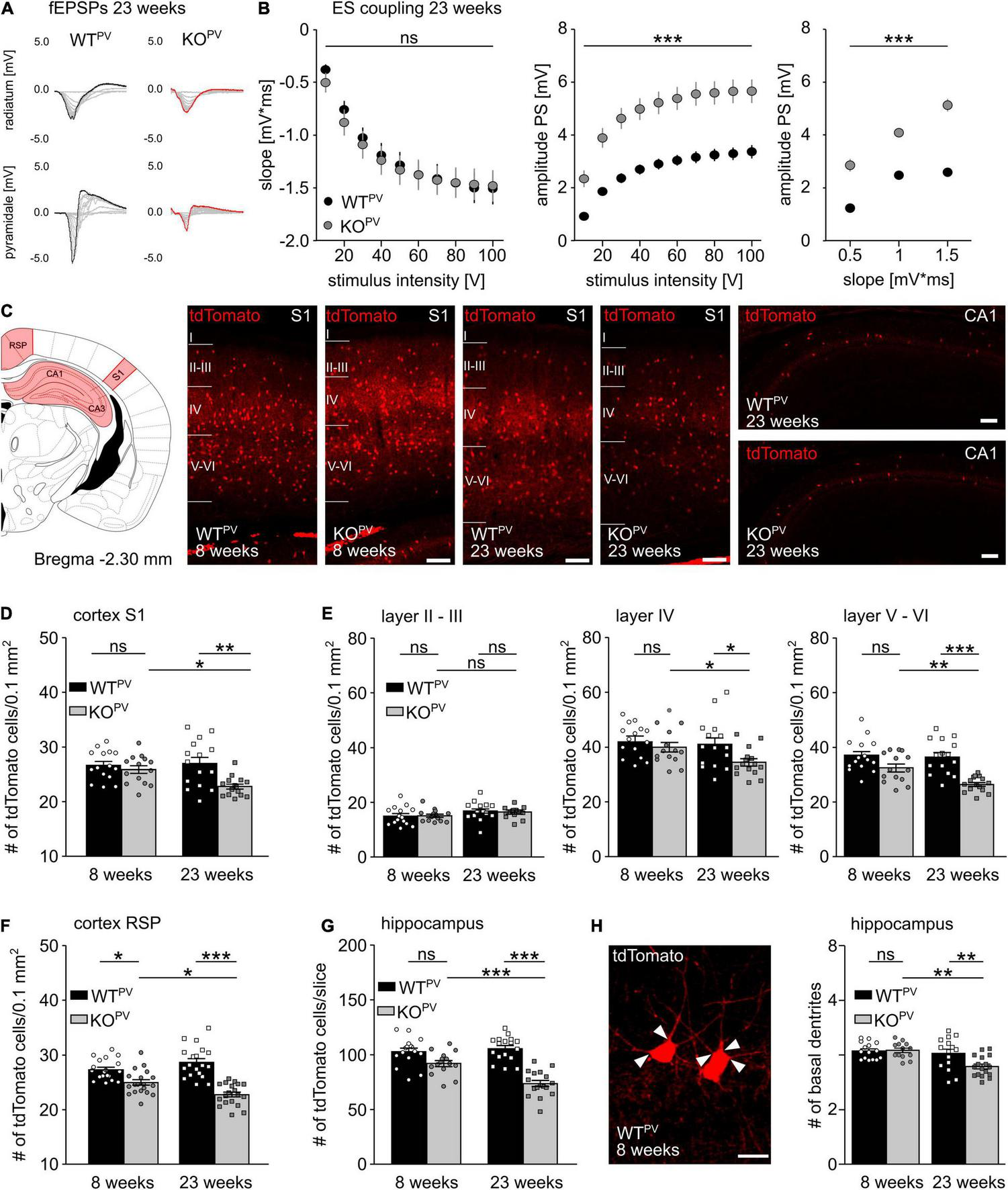 Loss of PV-INs in KCC2 KOPV mice. (A) Representative examples of fEPSPs recorded in the stratum radiatum and stratum pyramidale of 23-week-old WTPV and KCC2 KOPV mice. (B) E-S-coupling is increased in 23-week-old KCC2 KOPV mice (n = 24/33 slices from N = 5/5 mice; 2-way ANOVA repeated measure; Bonferroni post-test; ***p < 0.0001). (C) Illustration of the brain regions (red) for the quantification of tdTomato-positive neurons. Representative images of tdTomato-positive cells from the somatosensory cortex (S1) of WTPV (left) and KCC2 KOPV (right) mice at 23 weeks of age and hippocampus CA1 of 23-week-old mice. Scale bars 100 μm. (D) Number of tdTomato-positive cells per 0.1 mm2 of a 30 μm thick section of S1 of 8- and 23-week-old KCC2 WTPV and KOPV mice (n = 15/15 slices; N = 5/5 mice; 1-way ANOVA; Bonferroni post-test; *p < 0.05; **p < 0.01). (E) Number of tdTomato-positive cells per 0.1 mm2 and layer of a 30 μm thick section of S1 (n = 15/15 slices; N = 5/5 mice; 1-way ANOVA; Bonferroni post-test; ns not significant; *p < 0.05; **p < 0.01; ***p < 0.001). (F) Number of tdTomato-positive cells per 0.1mm2 of a 30 μm thick section of the retrosplenial cortex (RSP) of 8- and 23-week-old WTPV and KCC2 KOPV mice (n = 17/15 slices; N = 5/5 mice; 1-way ANOVA; Bonferroni post-test; *p < 0.05; ***p < 0.0001). (G) Quantification of tdTomato-positive cells in a 30 μm thick hippocampal section (Bregma -2.3 mm, 1 hemisphere) of 8- and 23-week-old WTPV and KCC2 KOPV mice (n = 15/15 slices; N = 5/5 mice; 1-way ANOVA; Bonferroni post-test; ***p < 0.0001). Individual numbers for D-G are provided in Supplementary Table 1. (H) The number of basal dendrites (arrowheads) of tdTomato-positive neurons in the hippocampus is slightly decreased in 23-week-old KCC2 KOPV mice (WT 8 weeks: 4.2 ± 0.1; KO 8 weeks: 4.2 ± 0.1; WT 23 weeks: 4.1 ± 0.2; KO 23 weeks: 3.6 ± 0.1; n = 15/15 slices from N = 5/5 mice; 1-way ANOVA; Bonferroni‘s multiple comparison test; **p < 0,001).