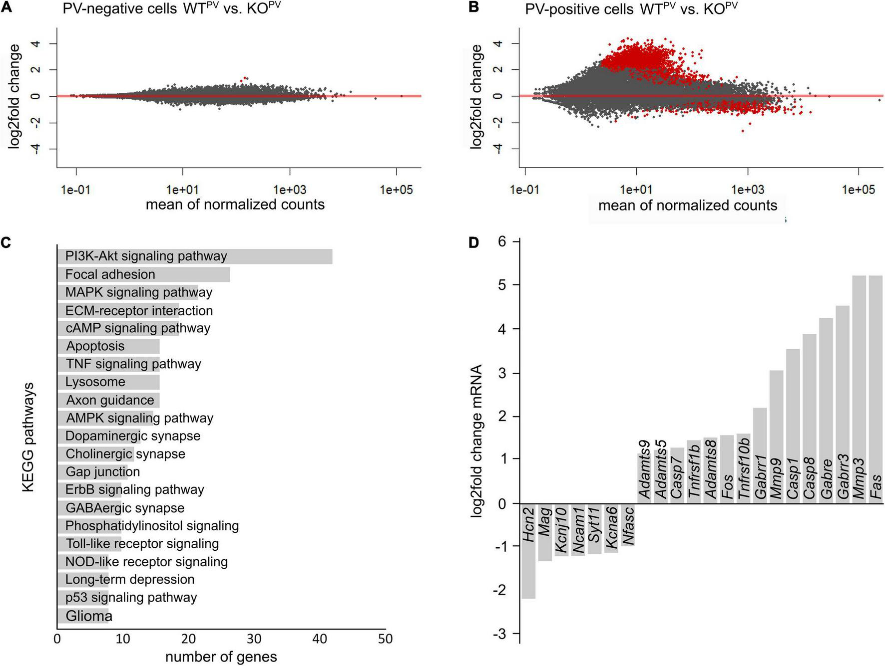Transcriptional profiling of PV-INs. (A,B) MA-plot illustrating differentially expressed genes in PV-negative (A) and PV-positive (B) cells isolated from 23-week-old WTPV and KCC2 KOPV mice (n = 4/4 experiment; N = 8/8 mice (brains from 2 mice of the same genotype were pooled per experiment); red dots p < 0.05; Benjamini adjusted). (C) KEGG pathway enrichment analysis of 1,126 differentially expressed genes (p < 0.05; Benjamini adjusted). (D) Selected differentially expressed genes in PV-INs of KCC2 KOPV mice.