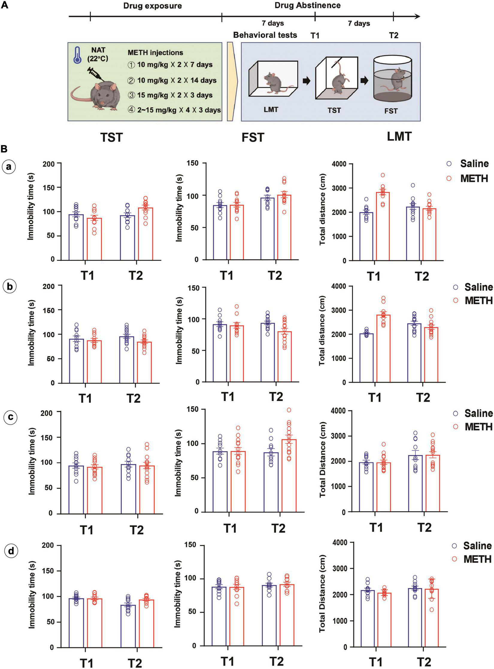 Longer-term (10 mg/kg × 2, 7 and 14 days), higher dose (15 mg/kg × 4, 3 days) or escalating-dose (2–15 mg/kg, 3 days) regimen of METH treatments under normal ambient temperature (22°C) failed to induce depression-like behaviors in mice. (A) Timeline of drug treatment and behavioral tests. (B) Different METH treatment procedures (a: 10 mg/kg × 2, 7 days; b: 10 mg/kg × 2, 14 days; c: 15 mg/kg × 4, 3 days; d: 2, 2, 5, 5, 5, 5, 10, 10, 10, 10, 15, and 15 mg/kg in 3 days) were performed in mice, and the depression-like behaviors and locomotion were tested at 7 (T1) and 14 (T2) days after METH exposure (a:n = 10 and 11; b:n = 10 and 12; c:n = 10 and 13; d:n = 10 and 10). Data are expressed as the mean ± SEM.