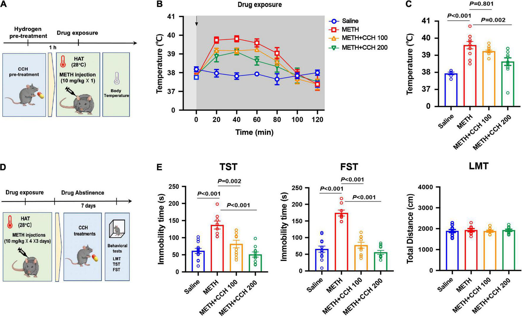 Herein, we firstly demonstrated the role of hyperthermia in METH-induced depression-like behaviors in mice. The results of present study revealed that HAT (28°C) aggravates METH-induced hyperthermia and plays a key role in METH-induced depression-like behaviors. Secondly, we further clarified the effect of CCH, on METH-induced hyperthermia and behavioral abnormality. Treatment with CCH significantly inhibited METH-induced hippocampal synaptic plasticity damage and attenuated the rise in oxidative stress products and inflammatory cytokines in the hippocampus. Therefore, our study suggested that CCH used as an efficient hydrogen-rich agent is a novel and effective treatment of METH-induced psychiatric disorders.