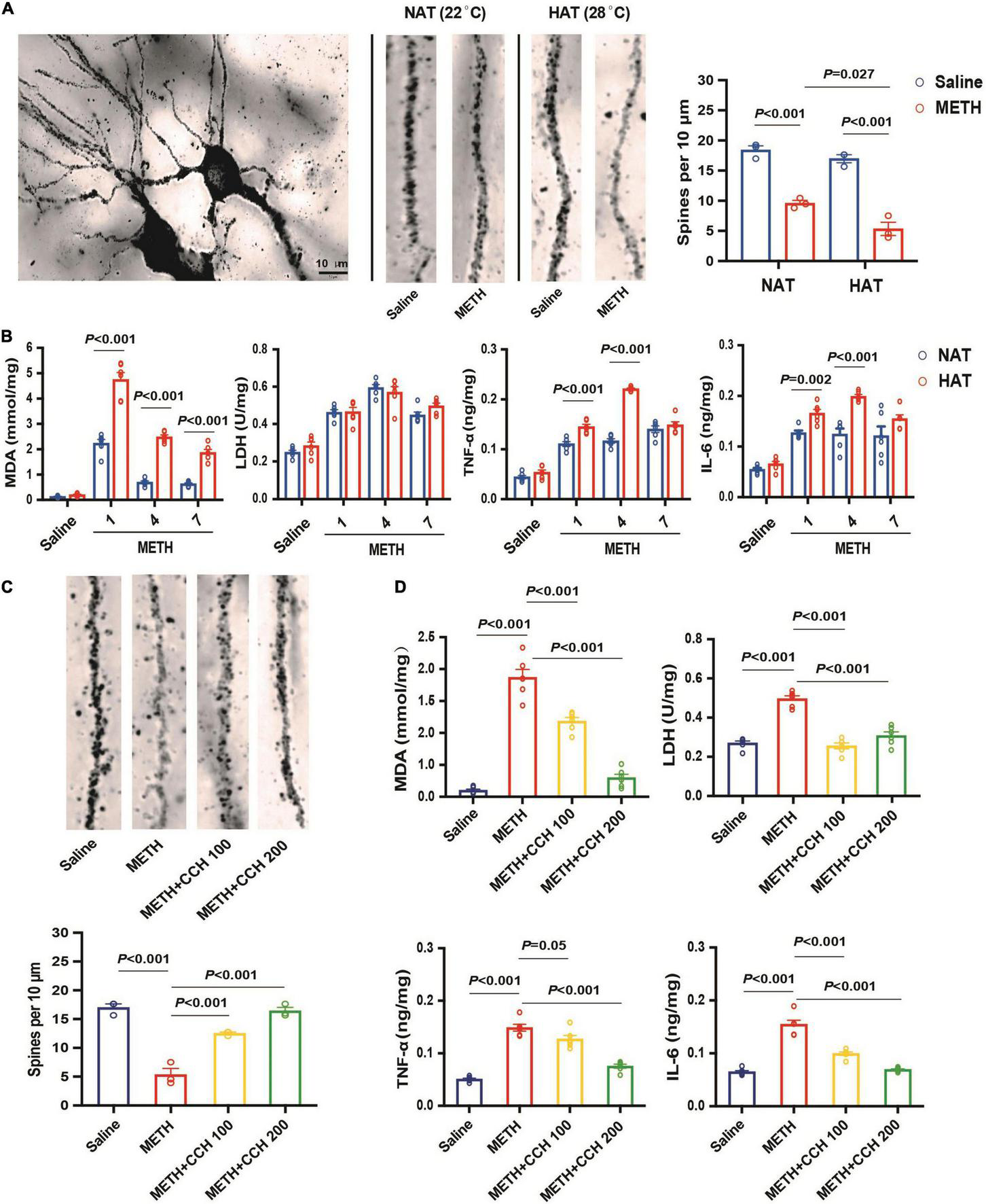 In this study, animals were treated with METH in different ambient temperatures to investigate the role of hyperthermia in METH-induced depression-like behaviors via tail suspension test (TST), forced swimming test (FST), and locomotion test (LMT). In addition, the effect of CCH on METH-induced hyperthermia and depression-like behaviors was also explored. As the damage of hippocampal neurons plays a key role in plasticity regulation of synapses and a critical role in the mechanism of depression, Golgi staining in hippocampus was conducted, and the index of oxidative stress and neuroinflammation were also measured by the detection of lactate dehydrogenase (LDH), malondialdehyde (MDA), IL-6 and TNF-α levels.