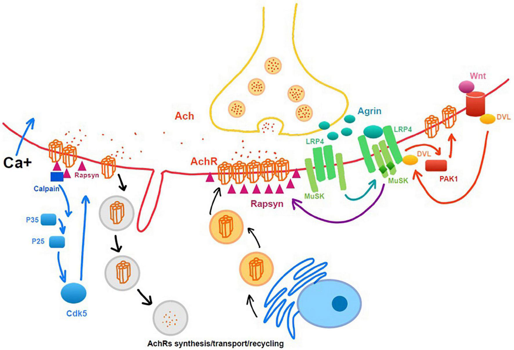 Several signaling are involved in the processes of NMJ formation, maturation, and maintenance. Among all the molecular mechanisms, Agrin-LRP4P-MuSK signaling, DOK7 signaling, and Wnt pathways are classic pathways with strong evidence in formation and maintenance of NMJ, while Ach-CDK5-Calpain has more connections with dispersion of AChRs and degeneration of NMJ. Previous reviews (Gonzalez-Freire et al., 2014; Rodríguez Cruz et al., 2020) have systematically discussed about different molecules participating in different physiological and pathological processes, such as aging and some inherited disorders. However, whether these signaling pathways are activated following denervation, can be still confused.