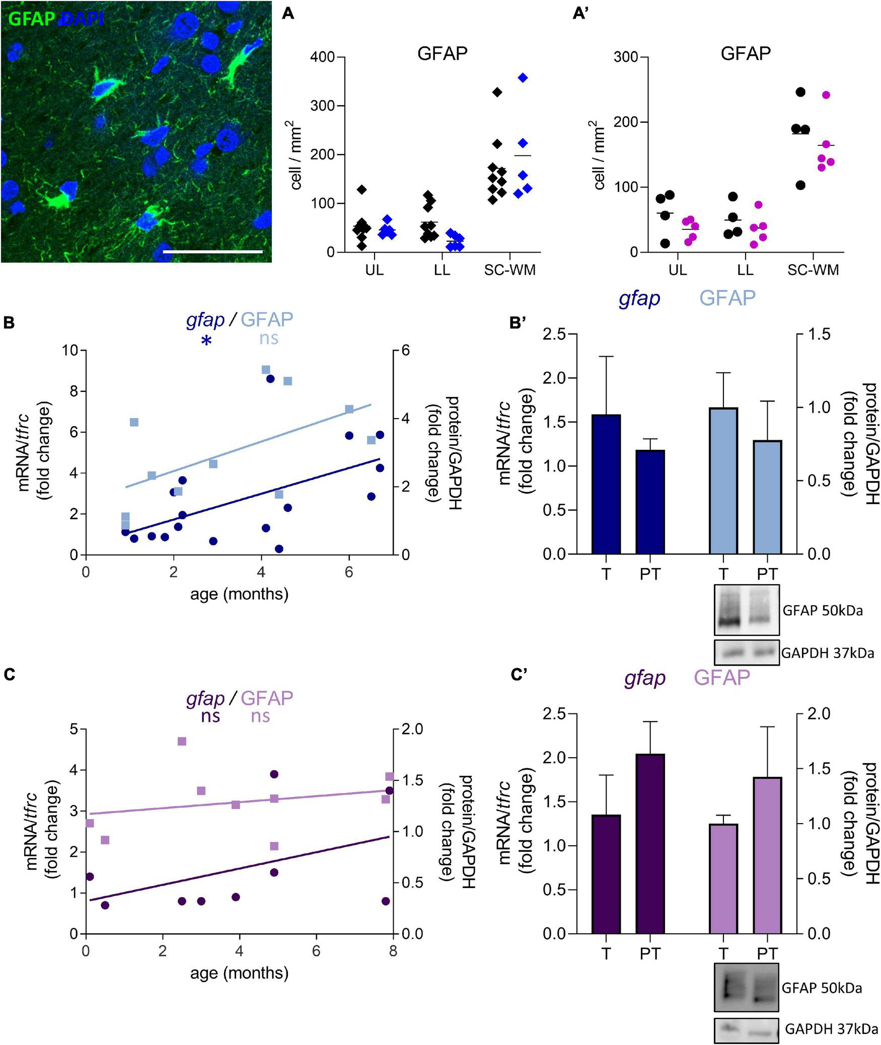 Human samples were homogenized in RIPA lysis buffer with proteinase inhibitors (Santa Cruz Biotechnology, Dallas, TX, United States, sc24948). Protein extracts, 40 μg per lane, were loaded onto 4–20% gradient gels (NuSep Inc., Germantown, MD, United States, NB10-420). Gels were electrotransferred to a 0.2 μm nitrocellulose membrane (Bio-Rad, 1620174). Blots were blocked in 5% milk in tris-buffered saline, 0.1% Tween 20 (TBST) for 1 h, and then incubated at 4 °C overnight with one of the following antibodies raised against: AATM (1:1000, sc-271702, Santa Cruz Biotechnology), AQP4 (1:1000, sc-390488), CX30 (1:1000, sc-81802), CX43 (1:1000, sc-271837), EAAT1 (1:500, sc-515839), GABRA1-6 (1:250, sc-376282), GAPDH (1:2000, sc-32233), GAT-3 (1:250, sc-376001), GDH1/2 (1:1000, sc-515542), GEPH (1:1000, sc-25311), GS (1:1000, sc-74430), MAOB (1:250, sc-515354), SNAT5 (1:1000, sc-515813), VIAAT (1:500, sc-393373), GBRD (1:250, Novus Biologicals, Littleton, CO, United States, NB300-200) or GABRG1 (1:100, Alomone Labs, Jerusalem, Israel, AGA-016). Bands were detected with appropriate horseradish peroxide-conjugated secondary antibodies, reacted with chemiluminescent ECL substrate (Bio-Rad, 1705060) and visualized with a Bio-Rad ChemiDoc Imaging system. Band intensity was measured using the ImageJ program (NIH) and normalized with GAPDH.