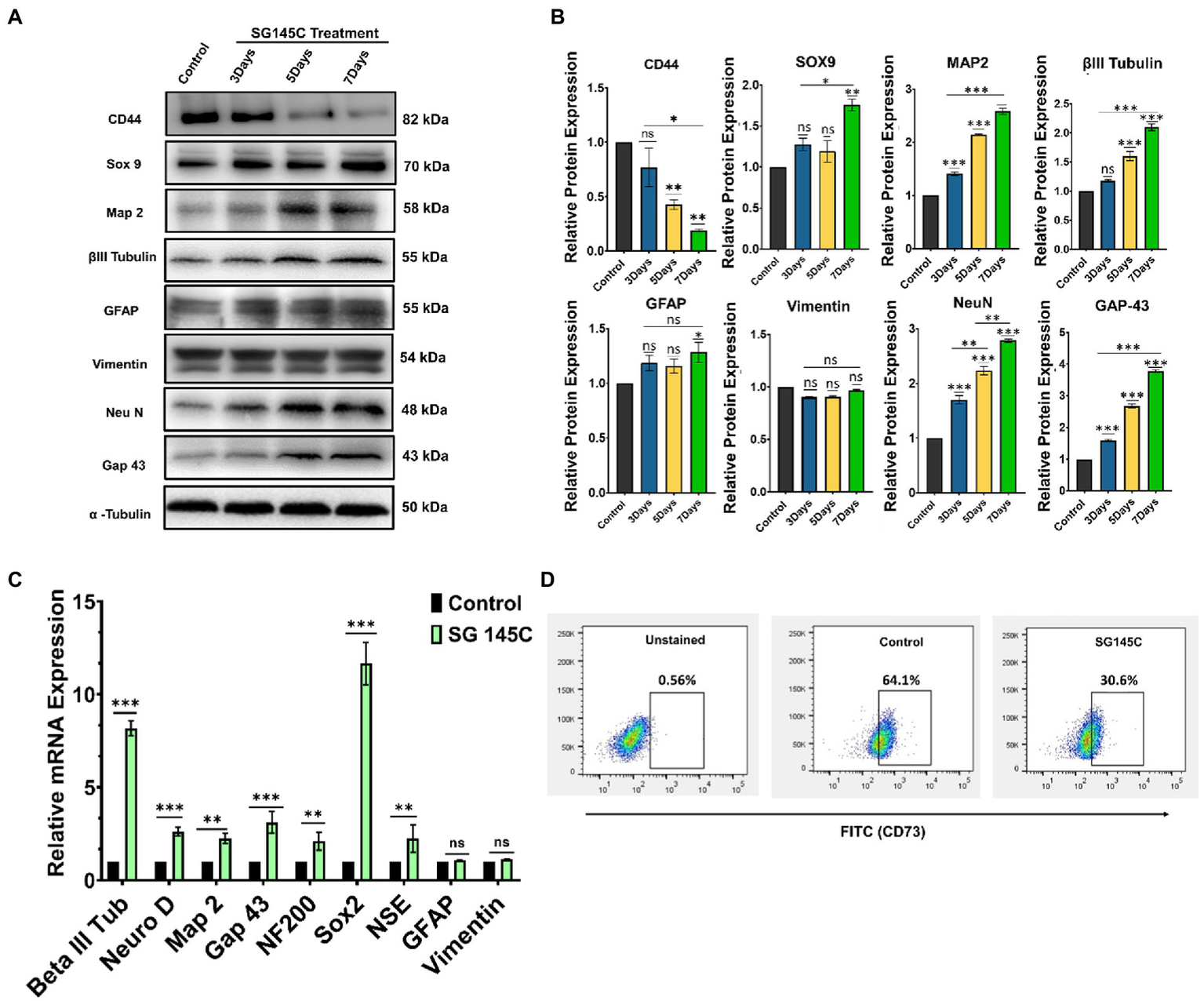 Characterization of the differentiated neurons. (A). Immunoblot analysis to check the expression of neuronal marker proteins at various time points after treatment with 5 μM SG-145C followed by its (B) densitometric analysis. (C) qPCR analysis reveals the expression pattern of the neuronal marker genes in the transdifferentiated neurons after the treatment with SG-145C. (D) FACS analysis reveals the reduction in mesenchymal stem cell marker CD73 after differentiation. Significance was calculated using one-way Anova for Western Blots and student’s unpaired t-test for qPCR. *p < 0.05; **p < 0.01; ***p < 0.001.