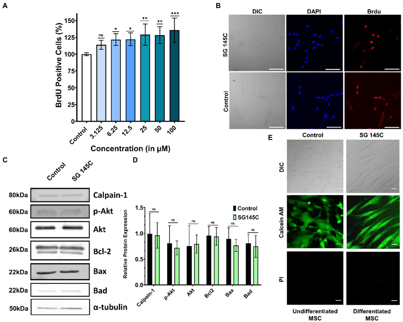 Brdu Assay revealed there is no effect in the population of proliferating cells after the treatment with SG-145C for 24 h (Figure 5A) as compared to Control (undifferentiated MSC’s). ICC data also showed a significant number of proliferating cells identified by BrdU staining after the treatment which is comparable to that of control (Figure 5B). Cell homeostasis was verified using immunoblots of apoptotic markers Bad, Bax, Bcl2, and Calpain-1, which demonstrated no significant changes after 7 days of treatment. There was also no increase in alternate autophagy pathways as we observed unchanged Akt and P-Akt levels (Figures 5C,D). A live-dead assay was also performed to assess the cytocompatibility of SG-145C, which reveals that all the cells are viable and intact after the treatment (Figure 5E).