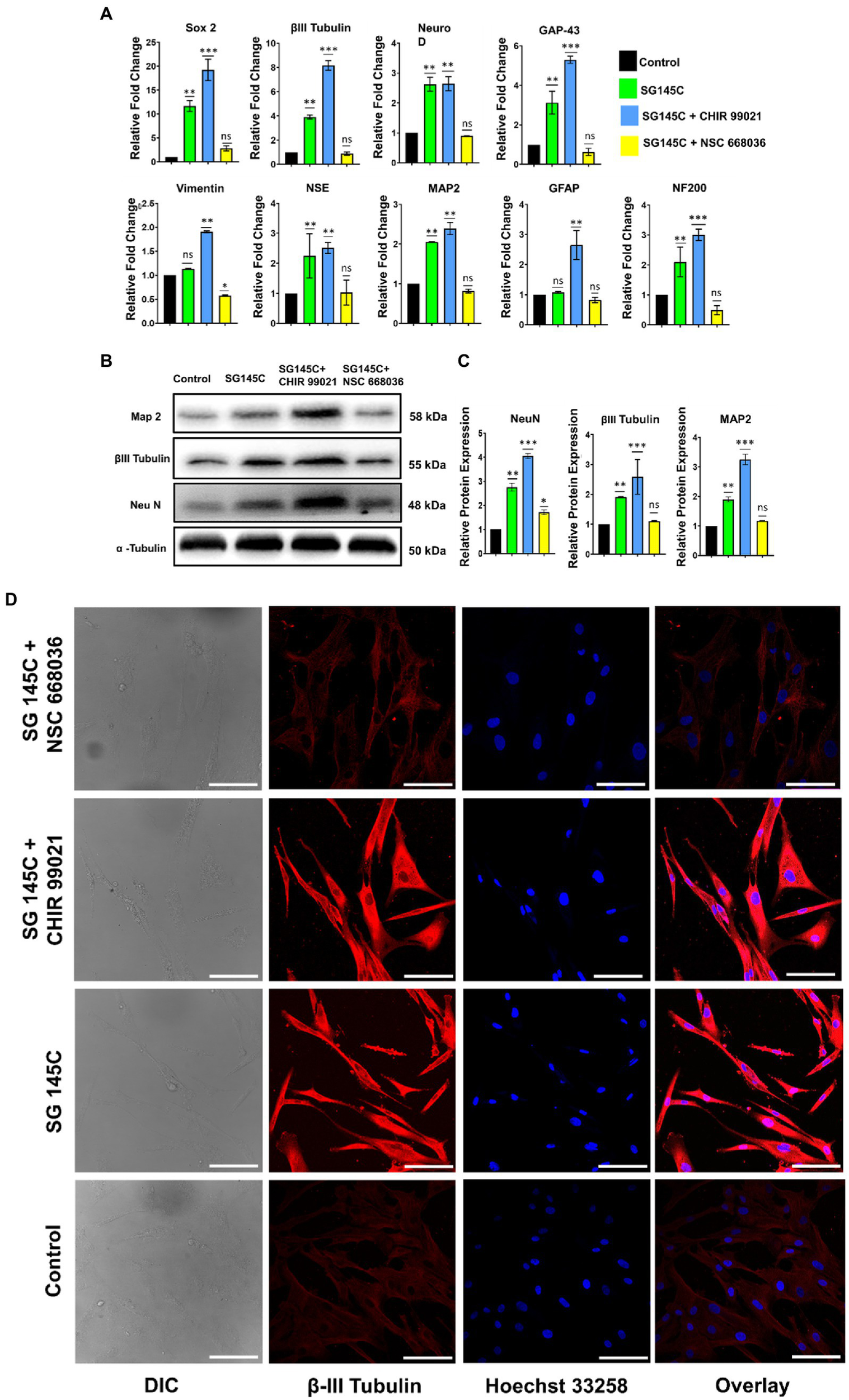 SG-145C induced trans-differentiation proceeds via the Wnt pathway. (A) qPCR and (B,C) immunoblot analysis comparing the expression of neuron-specific genes in response to SG-145C in combination with Wnt pathway inhibitor NSC668036 and commercially available GSK-3β inhibitor CHIR99021. (D) ICC staining was performed to compare the level of trans-differentiation in response to the mentioned inhibitors in combination with SG-145C. β-III Tubulin (AF-488) was used as neuronal marker proteins for visualization. Images were captured in 20X magnification where the scale bar corresponds to 70 µm. n = 3 for all sets of experiments and significance was calculated using one-way Anova *p < 0.05, **p < 0.01, ***p < 0.001.