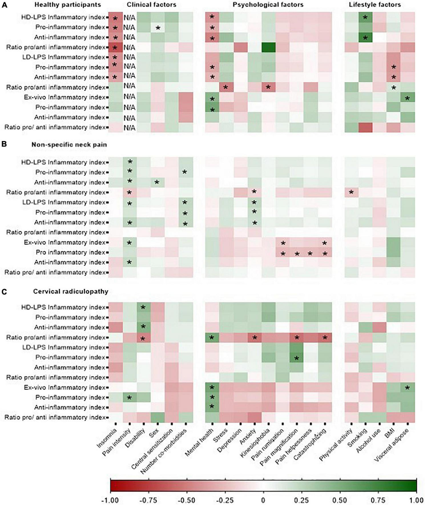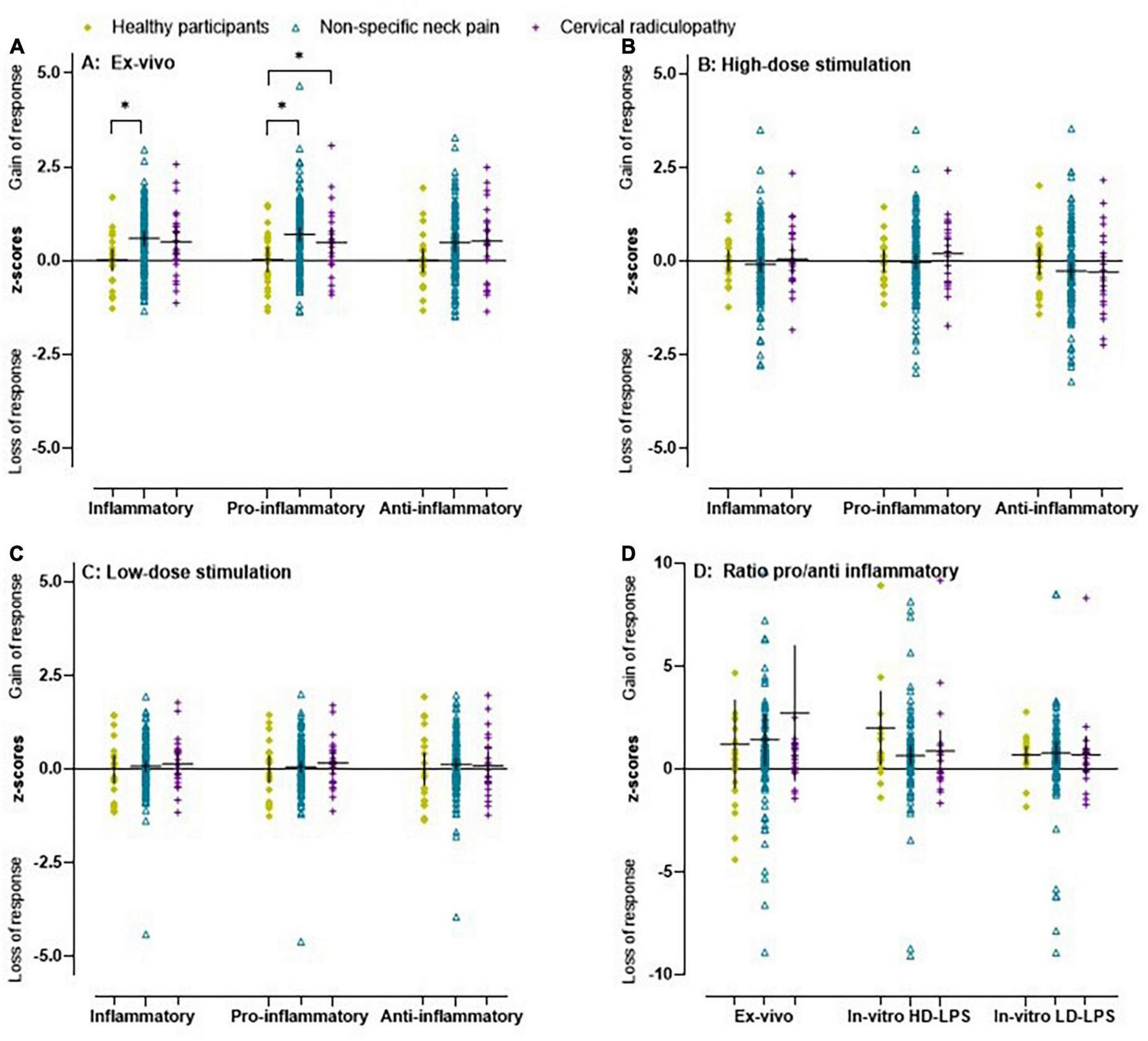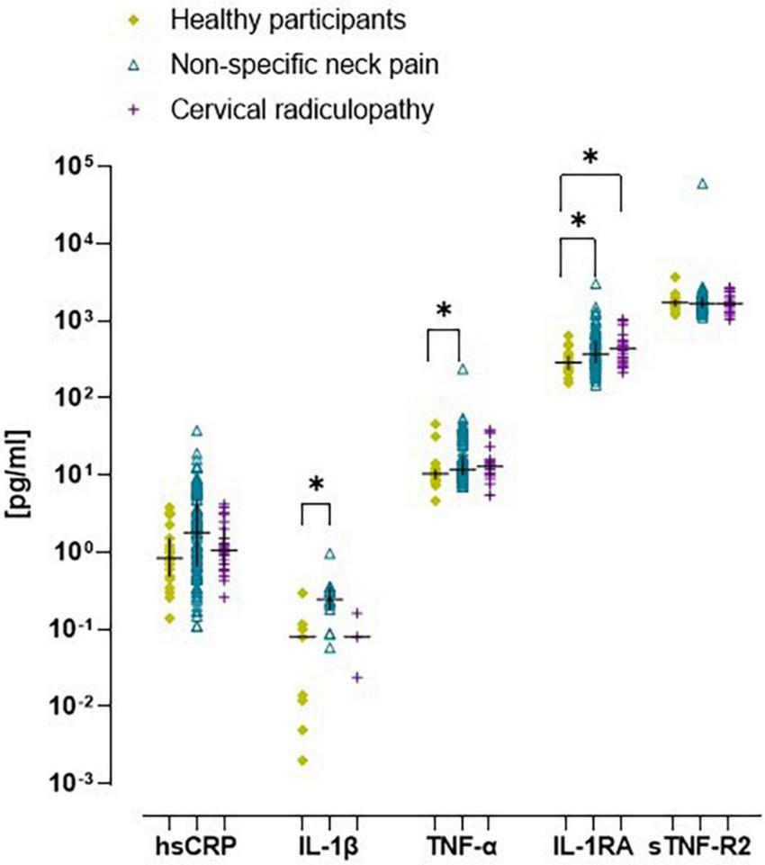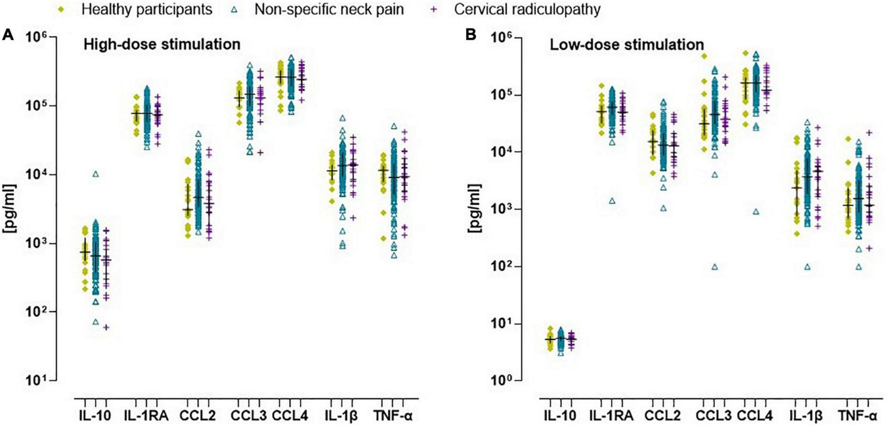 Despite the increased interest in neuroimmune responses in neck pain, previous studies only evaluated a limited subset of inflammatory markers (Teodorczyk-Injeyan et al., 2011, 2019; Kwok et al., 2012, 2013), did not investigate associations between neuroimmune responses and psychological or lifestyle factors (Teodorczyk-Injeyan et al., 2011, 2019; Kwok et al., 2012, 2013; Farrell et al., 2020), and used diverse preanalytical and analytical methods [e.g., either whole-blood cultures or peripheral blood mononuclear cell (PBMC) stimulation] (Teodorczyk-Injeyan et al., 2011, 2019; Kwok et al., 2012, 2013; Farrell et al., 2020). These studies provide an incomplete picture of the neuroimmune responses in people with neck pain. Therefore, we conducted a cross-sectional study which evaluated a broad range of neuroimmune responses in people with and without neck pain. This study aimed to (1) compare systemic neuroimmune responses between people with non-specific neck pain, cervical radiculopathy and healthy participants, and (2) to study the associations between neuroimmune responses and clinical, psychological and lifestyle factors.