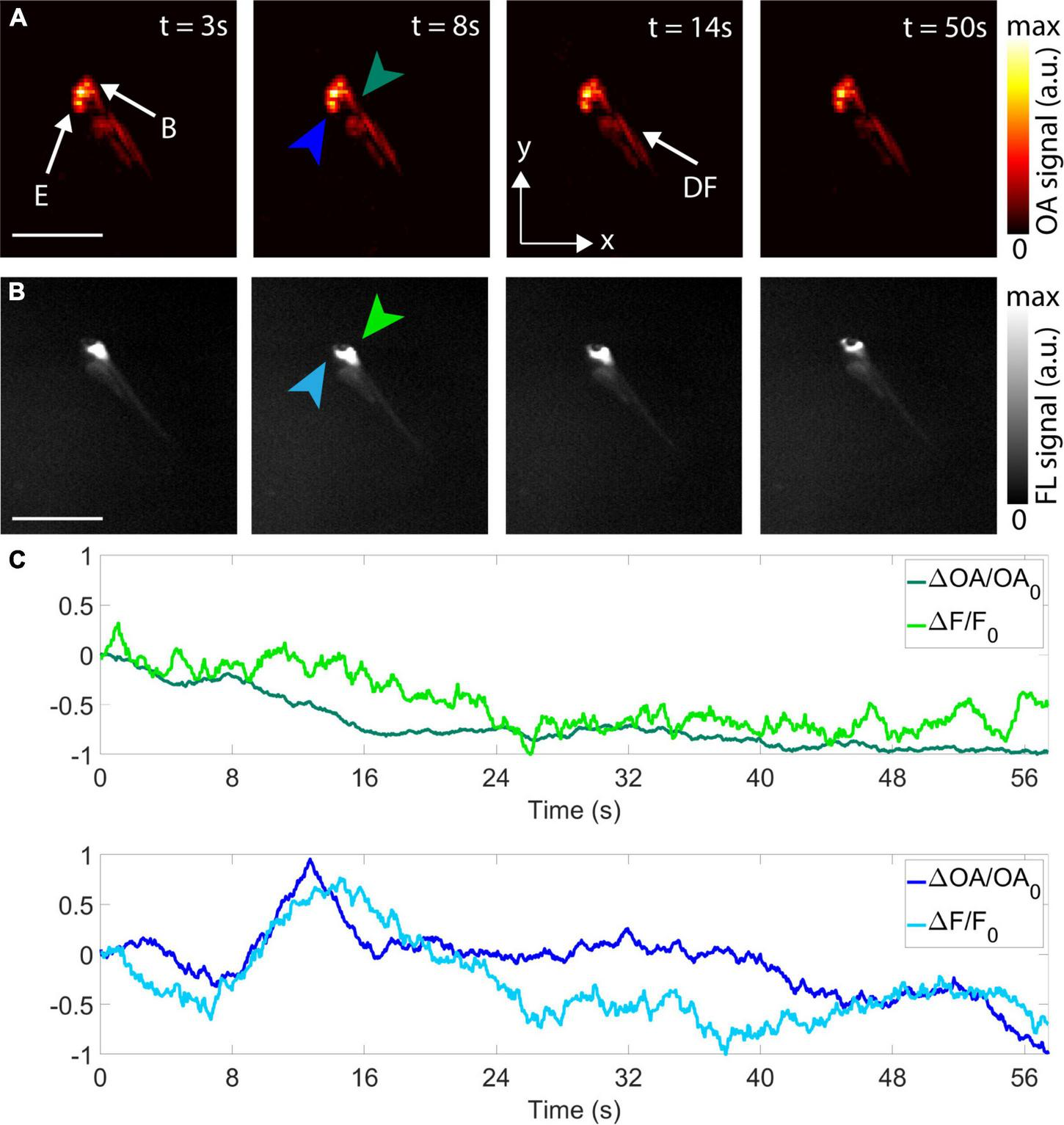 Imaging of epileptic seizure propagation in 5 dpf zebrafish larvae. (A) Optoacoustic tomography (OAT) images at 3, 8, 14, and 50 s after the beginning of the acquisition–maximum intensity projections (MIPs) along the z direction are shown. E, eyes; B, brain; DF, dorsal fin. (B) Corresponding FL images. (C) Temporal profiles of the differential OA [ΔOA/OA0 = (OA–OA0)/OA0, green and blue plots] and the differential FL [ΔF/F0 = (F–F0)/F0, light green and light blue plots] signals for two different points in the hindbrain (green and light green arrows) and forebrain (blue and light blue arrows). Scalebars–2 mm.