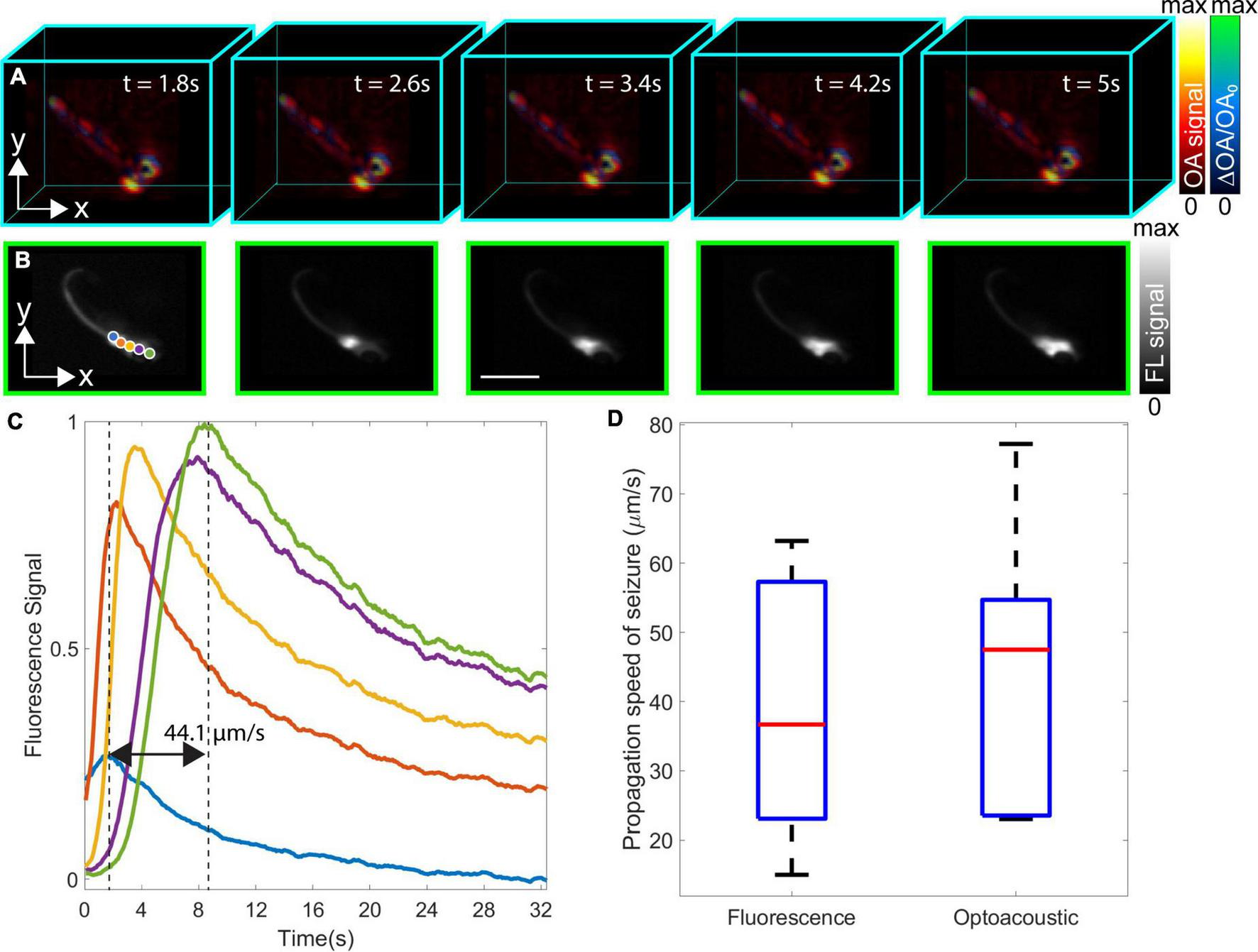 Neuronal activation maps for eaat2a–/– mutant zebrafish larvae exposed to 488 nm light were further built from the acquired OAT image sequence. For this, the relative OA signal changes (ΔOA/OA0) were superimposed onto the normalized (between 0 and maximum value) OA images at five selected time points, namely, 0, 3.2, 13.8, 20, and 42.2 s after the beginning of light-induced stimulation (Figure 3A). Both images were plotted in different colormaps, and a transparency map was applied to the image representing the activity map (relative OA changes). The relative OA signal changes across the zebrafish body exceeded 100%. These generally represent the relative changes in calcium signals corresponding to neuronal activity, although some baseline OA signal level exists that corresponds to background tissue absorption. Particularly, the measured relative changes may be smaller than the actual change in the GCaMP5G absorption, especially in the regions around the eyes where the background absorption is very high. As the epileptic seizure propagates, calcium signals are shown to increase in the spinal cord eventually reaching the tail fin. The spatio-temporal neuronal activation patterns from the hindbrain (where the seizure originated) toward the forebrain are also observed in the corresponding FL images (Figure 3B). Five regions of interest (ROIs) indicated with different colored circles (blue, orange, yellow, purple, and green) in Figure 3B were selected to better analyze the spatio-temporal signal profiles associated to the induced seizure. The peak signal for the selected points was shown to vary between 3 and 8 s after the beginning of light-induced stimulation (black dashed lines in Figure 3C). The measured propagation speed of the seizure was 44.1 μm/s. Propagation speed measurements in FL and OA images were repeated for other eaat2a–/– mutant zebrafish larvae (5 dpf, n = 7), represented with boxplots indicating the median, 25th and 75th percentiles in Figure 3D. The average seizure propagation speeds calculated from FL and OA images were 39.6, ± σ [58.6001, 20.5713] and 43.5, ± σ [64.3477, 22.5951] μm/s, respectively, indicating that the spatio-temporal resolution achieved with the OAT system is sufficient for accurately measuring the seizure propagation speed.