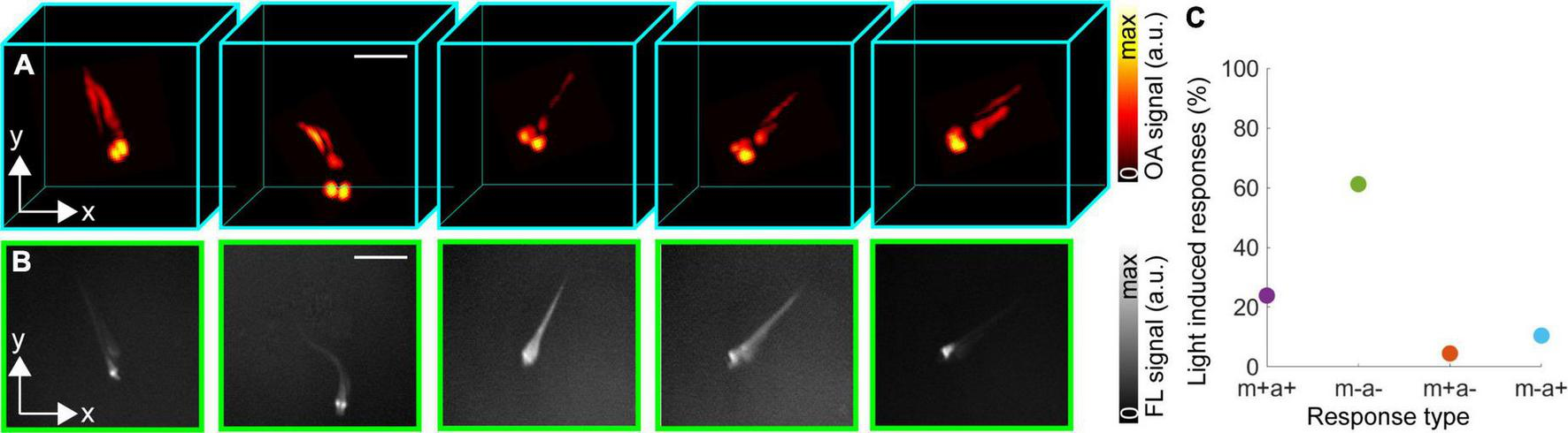 Aberrant swimming activity of the freely moving eaat2a–/– mutant zebrafish larva following light-induced stimulation at 488 nm. (A) Volumetric optoacoustic (OA) images at 0, 0.2, 1.2, 2.6, and 8 s after the stimulation beginning. (B) Corresponding fluorescence (FL) images. Scalebars–3 mm. (C) Light induced different types of responses (%) following 67 total stimulations in 12 eaat2a–/– mutant zebrafish larvae.