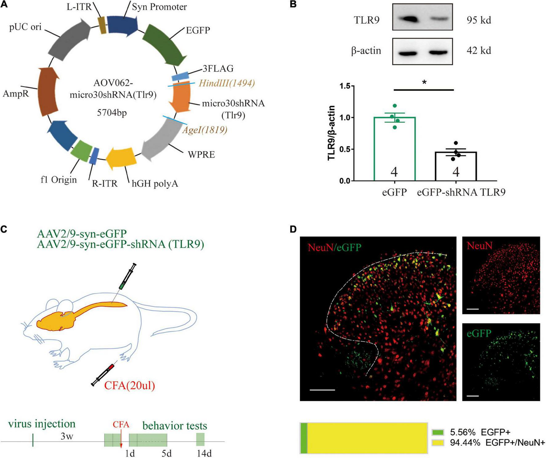 For the purpose of achieving downregulation of TLR9 in vivo by AAV, we first constructed a plasmid with effective downregulation of TLR9 in SY5Y cells, according to the previous study from our lab (Cui et al., 2020). The micro30 shRNA (Tlr9) sequence was cloned into the HindIII(1494) and AgeI(1503) sites of the AAV vector AOV062 pAAV-SYN-MCS-EGFP-3FLAG (Figure 4A). Western blot analysis showed significant knock-down effects of this plasmid (Figure 4B). Taking SYN as a promoter of mature neurons, the plasmid was packaged into the AAV2/9 vector, which can specifically transfect mature neurons. To assess whether neuronal TLR9 in the spinal cord was involved in CFA-induced persistent hyperalgesia, the virus with the neuronal specific promoter SYN delivering TLR9 shRNA was injected into the L4-L5 lumbar segment (Figure 4C). The EGFP image (green) was highly colocalized with neurons (red) in the dorsal spinal cord (Figure 4D).