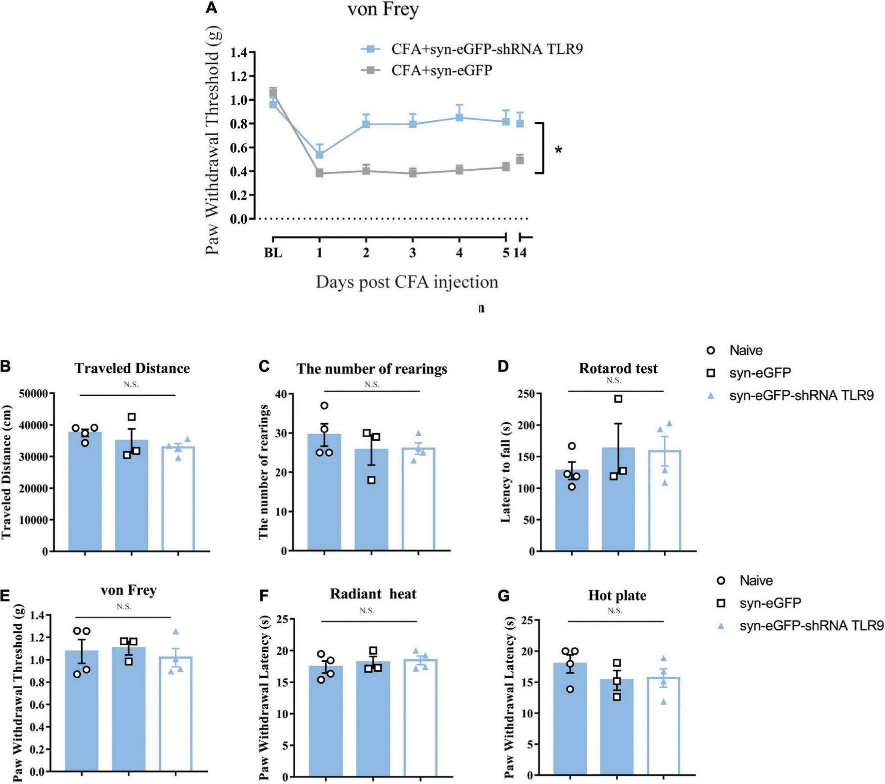 (A) Downregulation of neuronal TLR9 in the spinal cord increased the mechanical paw withdrawal threshold in CFA mice. Data are expressed as means ± SEM. Repeated measurements ANOVA is the statistical approach used. (B–G) The locomotive ability (open field, rotarod test), the mechanical sensitivity (von Frey) and thermal (radiant heat, hot plate) sensitivity was unaffected by virus to downregulate the neuronal TLR9 p > 0.05. Multiple comparisons using two-way ANOVA are the statistical approach.