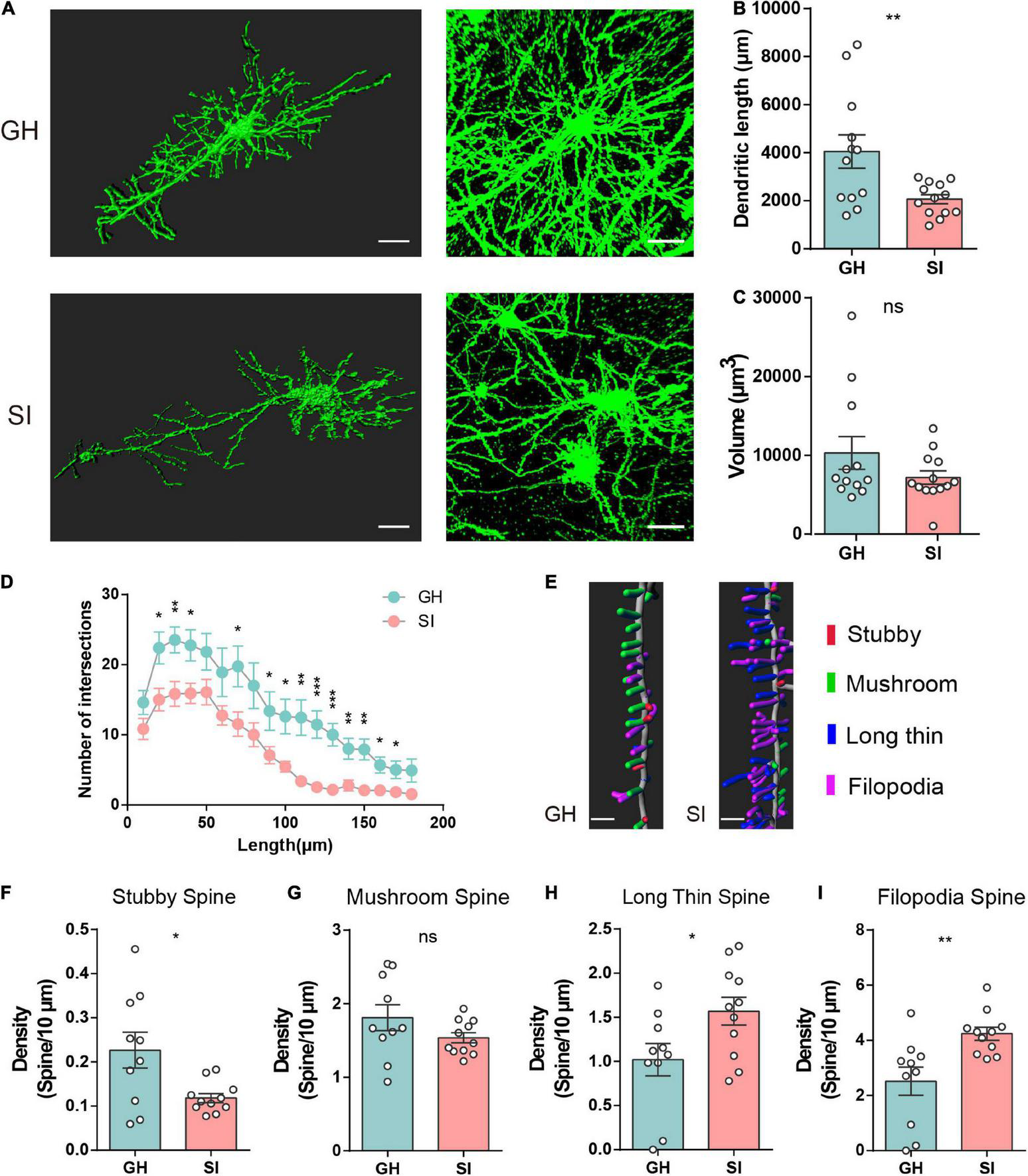 The dendritic length in the adolescent SI group was shorter than that in the corresponding GH group (Figures 2A,B), and no significant changes were observed between adult SI and GH mice (Supplementary Figure 2B). However, we did not find obvious changes in the total volume of dendrites in adolescent or adult SI mice (Figure 2C and Supplementary Figure 2C). Furthermore, the dendritic complexity of pyramidal neurons was significantly different between adolescent SI mice and GH mice, and the number of dendritic intersections was reduced in the mPFC of adolescent SI mice (Figure 2D); however, no differences between adult SI and GH mice were observed within the 110 μm radius (Supplementary Figure 2). These findings indicated that the dendritic complexity was impaired during adolescent social isolation.
