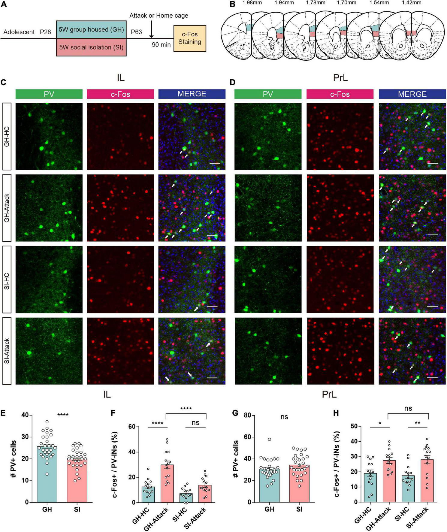 We first performed immunofluorescent costaining for PV+ interneurons and the immediate early gene c-Fos in tissues from adolescent SI and GH mice (Figure 3A) 1.5 h after aggression. The regions of interest are shown in Figure 3B for PrL and IL. The numbers of PV+ interneurons in the IL (Figures 3C, left and E) were significantly reduced under the SI condition compared with the GH condition. However, the number of PV+ interneurons in the PrL was similar between the SI and GH groups (Figures 3D, left and G).