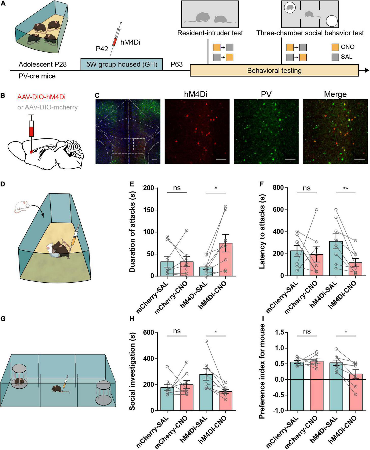 Based on the hypofunction of IL-PV+ interneurons in adolescent SI mice, we next asked whether inhibiting these PV+ interneurons in GH mice would induce a similar increase in attack behavior. The Cre-dependent adeno-associated virus (AAV2) was bilaterally injected into the IL of PV-Cre mice to express the engineered Gi-coupled hM4D receptor (Armbruster et al., 2007) along with the fluorescent reporter mCherry. Figures 4B,C depict the viral injection site and the spread of virus indicated by the presence of mCherry. The virus was primarily limited to the IL region and highly specific to PV+ interneurons.