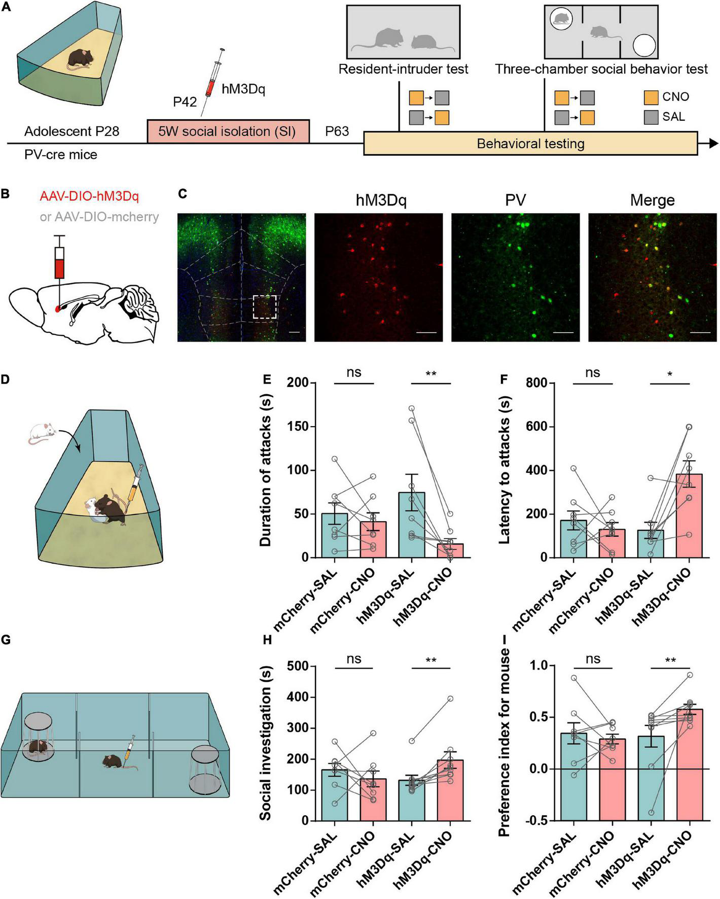 We wanted to further determine whether reactivation of IL-PV+ interneurons would be sufficient to correct the excessive aggression induced by adolescent SI. IL-PV+ interneurons were chemogenetically stimulated by bilateral injection of an excitatory designer receptor exclusively activated by the Gq-coupled hM3D receptor in the SI-exposed PV-Cre mice, while the control group received only a control virus containing a fluorescent mCherry protein. SI PV-Cre mice expressing hM3D were tested in a variety of behavioral tests, including the RI, 3-chamber and open field tests (Figure 5A). Then, we confirmed the targeting of the injection site using immunofluorescence costaining to validate the specificity of the virus in IL-PV+ interneurons (Figures 5B,C).