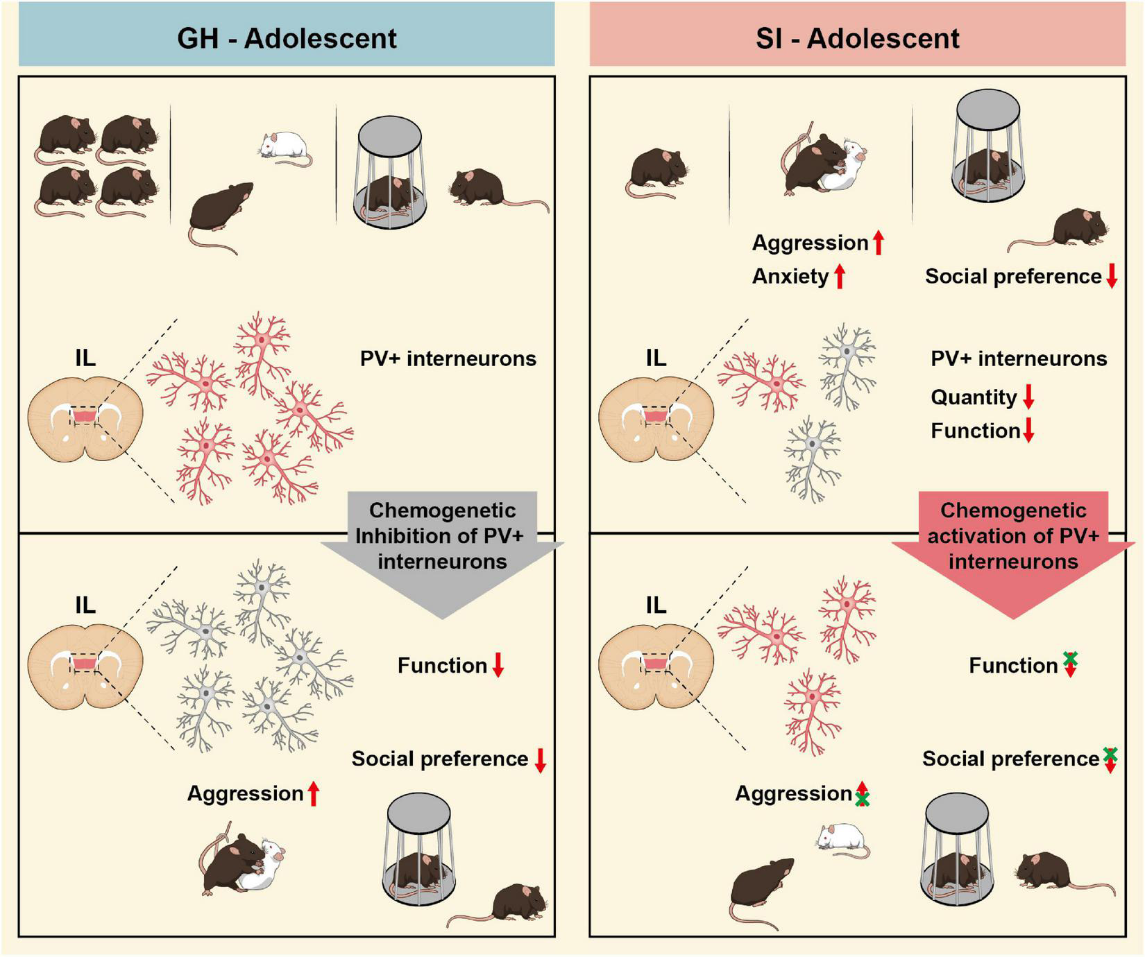 In this study, we investigated the relationship between adolescent social isolation-induced brain alterations and aggressive behavior. We demonstrate that after adolescent social isolation, the developmental processes in the mPFC brain region of mice were significantly impaired, not only by reduced synaptic plasticity of pyramidal neurons but also by a decrease in the quantity and activity of PV+ interneurons in the IL region, which was accompanied by excessive aggression, increased anxiety-like behavior and diminished social preference. Chemogenetic inhibition of IL-PV+ interneurons can mimic the abnormal aggression and social preference deficits in mice exposed to adolescent social isolation. Conversely, activation of PV+ interneurons prevented SI mice from exhibiting increased aggression and impaired social preference (Figure 6). Our study promotes an understanding of IL-PV+ interneuron involvement in adolescent social isolation, which provides the ability to directionally regulate aggression and social preference behaviors.